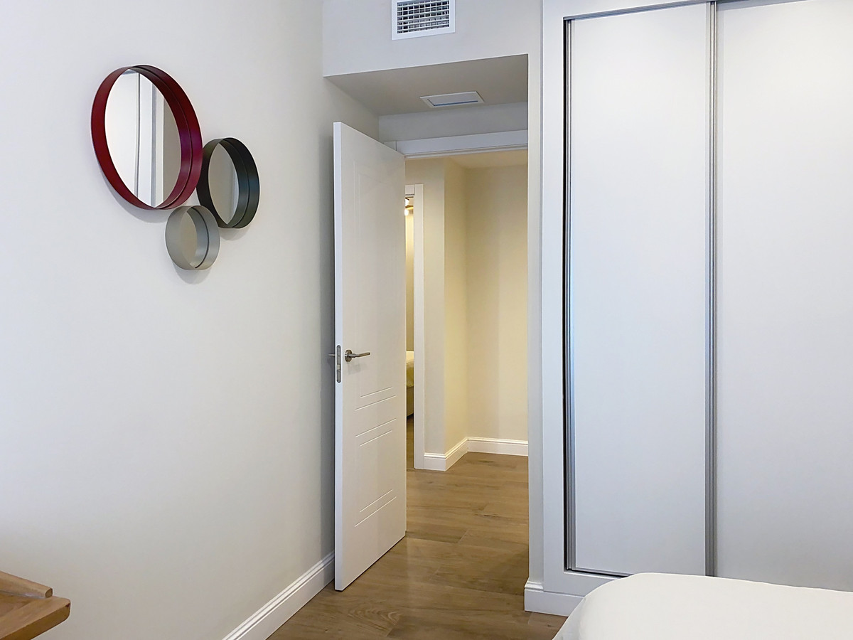 The apartment features three spacious bedrooms, all with new, lined, and illuminated built-in wardrobes, as well as ceiling fans and a powerful air conditioning system (8,000 frigories) that ensures maximum comfort throughout the year. The master bedroom has an en-suite bathroom with a modern shower and access to a balcony overlooking the interior of the complex, while the other two bedrooms—one currently used as a dressing room—share a second full bathroom. Both bathrooms stand out for their complete renovation with top-quality finishes, each featuring exterior windows that provide perfect ventilation. They include sliding glass shower screens designed to offer greater comfort and elegance.