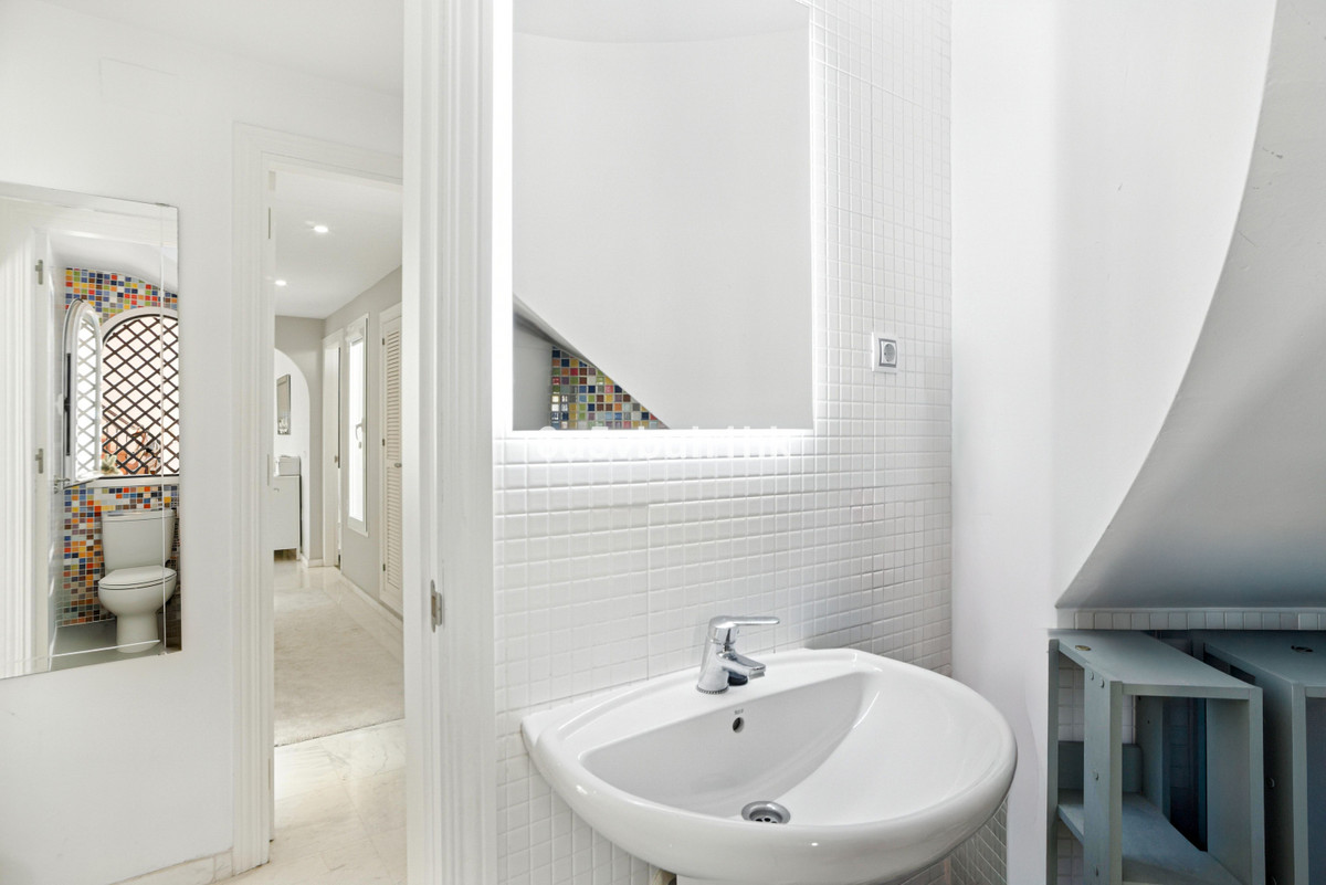 Au rez-de-chaussée se trouvent des toilettes invités et la chambre principale avec salle de bains attenante et accès direct à la terrasse. L'étage supérieur comprend un palier lumineux, une salle de bains complète et deux chambres, toutes deux avec accès à une terrasse offrant une vue partielle sur la mer.