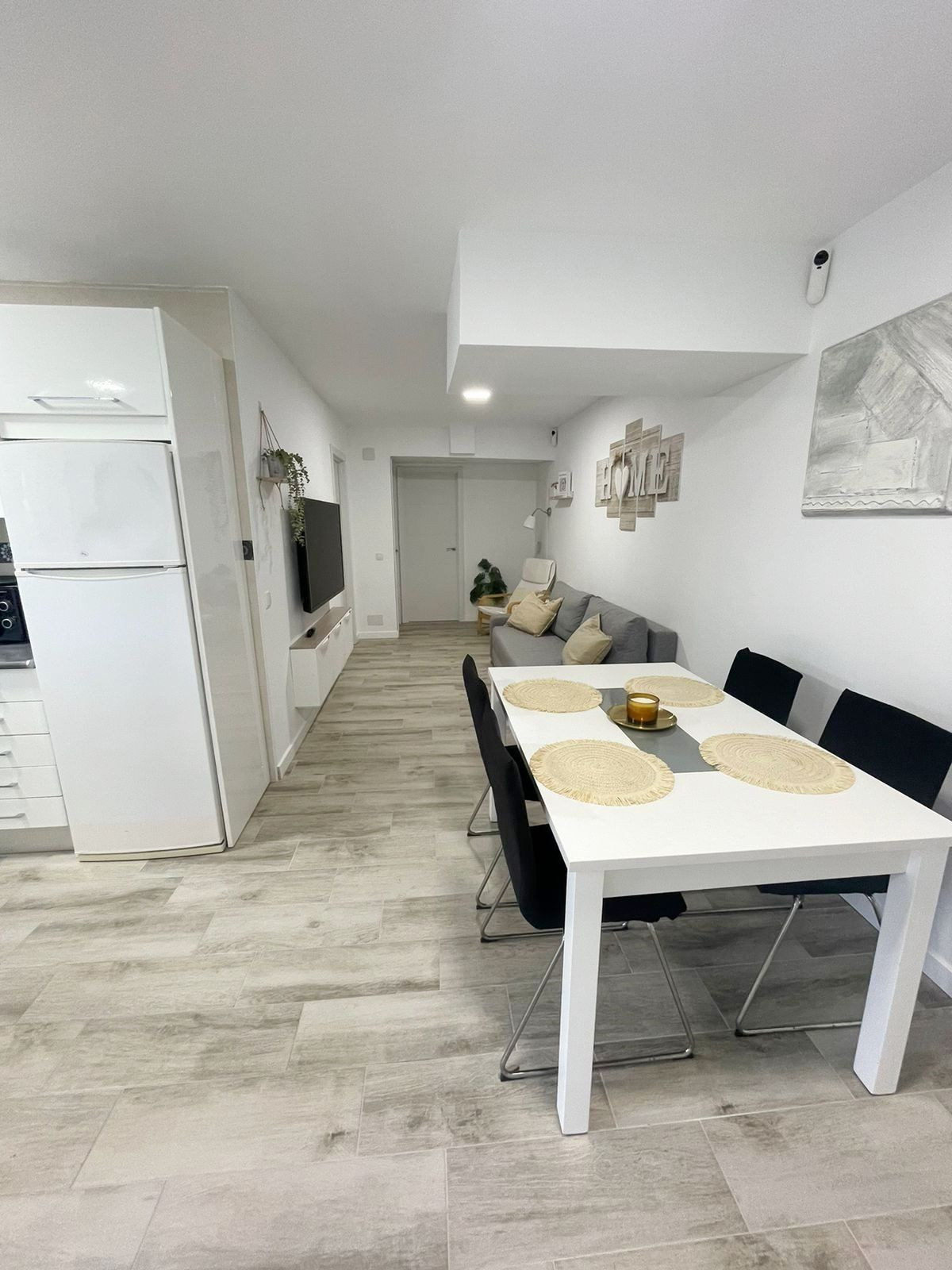Le salon-salle à manger est très cosy, idéal pour se détendre après une journée à la plage. La cuisine est entièrement équipée et dispose de placards intégrés optimisant l'espace de rangement.
