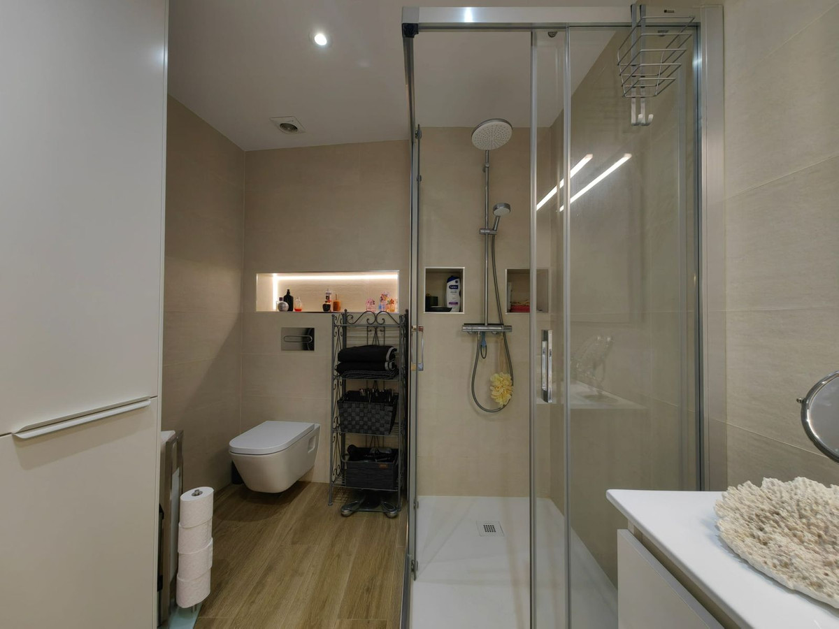 La chambre est complétée par une salle de bain moderne avec douche à l'italienne à portes coulissantes en verre et WC suspendus. Chaque détail a été soigneusement rénové selon les normes contemporaines les plus strictes, y compris une cuisine entièrement équipée avec des appareils électroménagers de qualité.