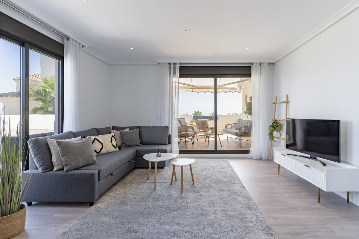 Bienvenue dans ce superbe appartement au premier étage, doté d'une spacieuse terrasse et d'un jacuzzi privé, situé dans une résidence sécurisée du quartier très prisé de Selwo à Estepona. Depuis la terrasse, vous profiterez chaque jour d'une vue panoramique imprenable sur la mer et les montagnes environnantes : idéal pour des moments de détente et des couchers de soleil inoubliables.