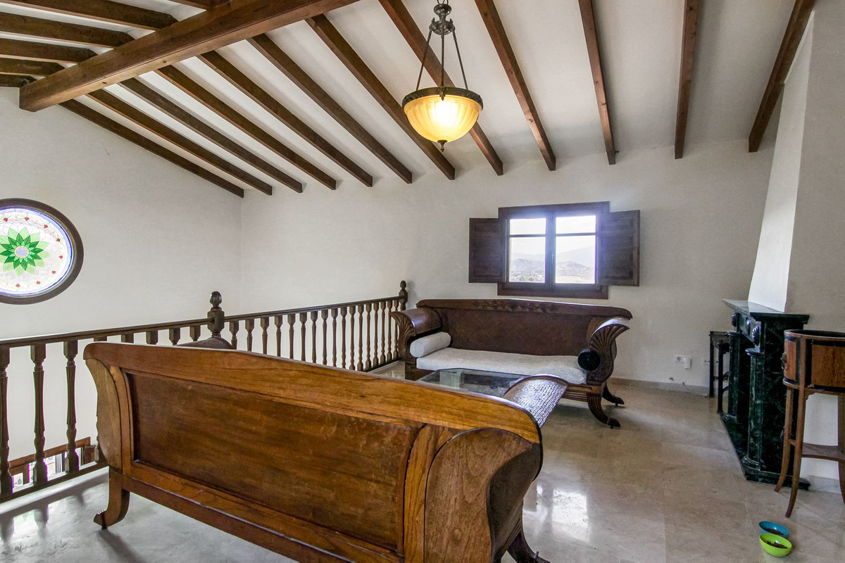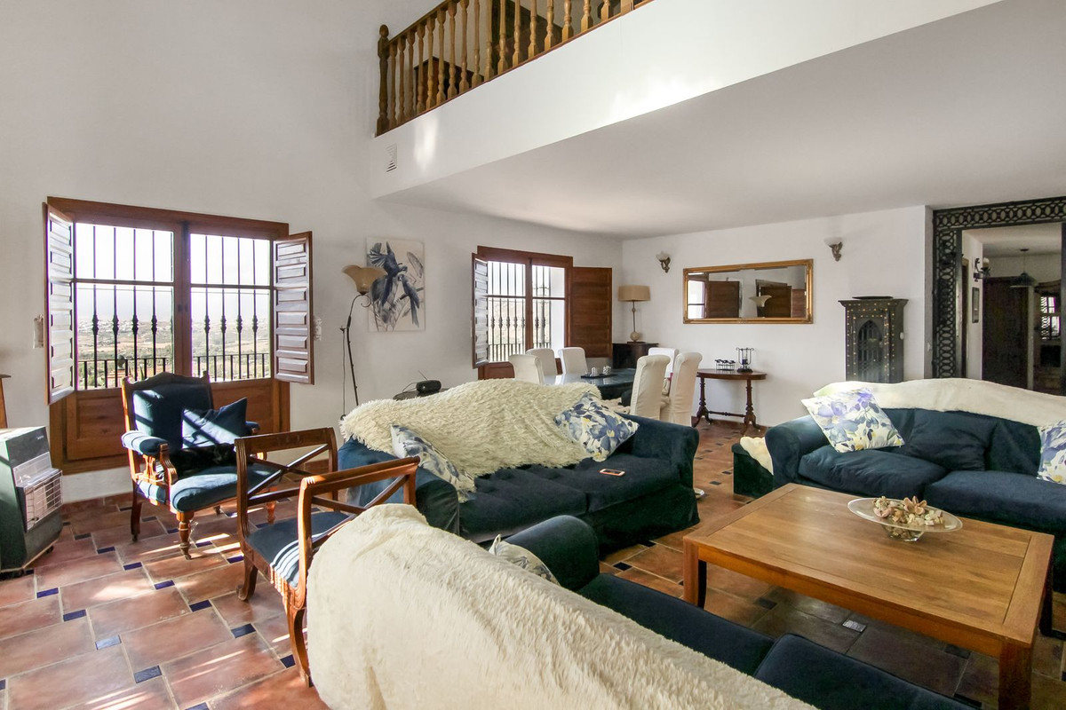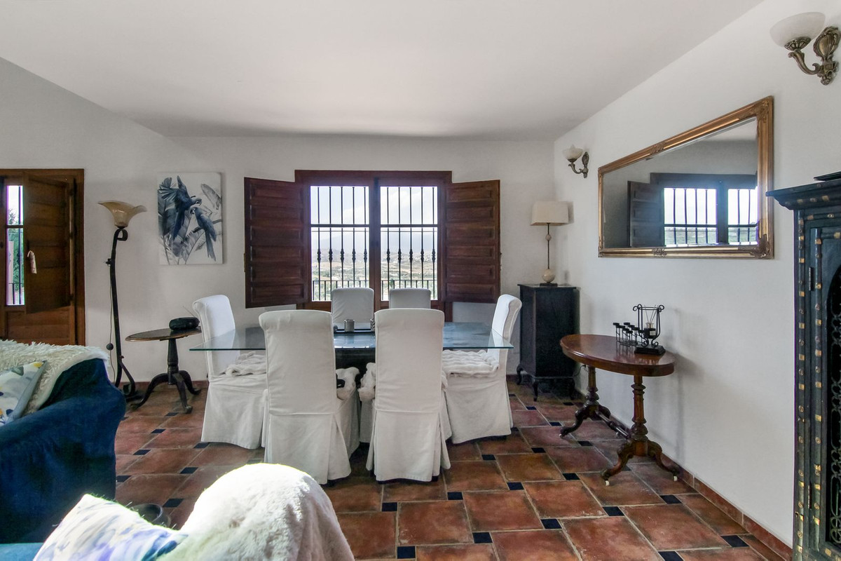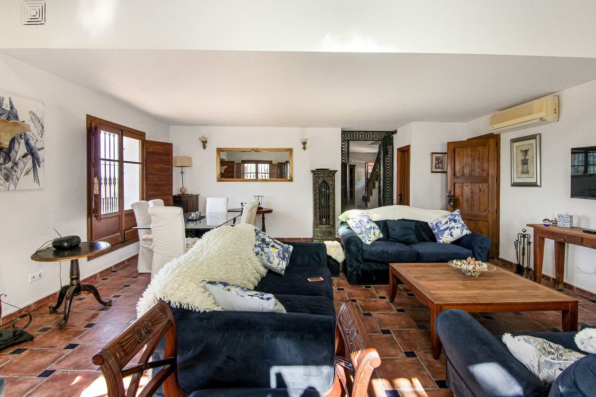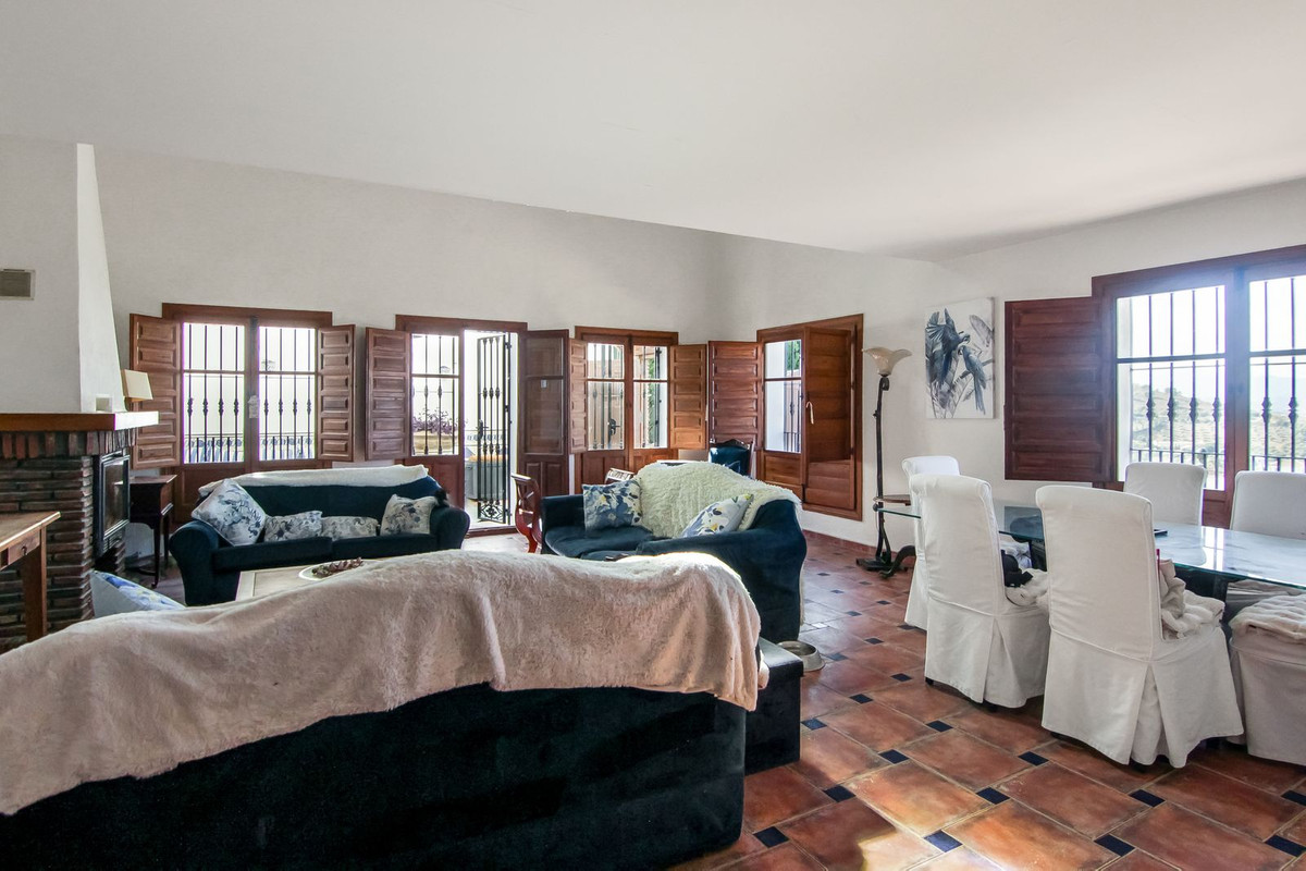 Living room is breathtaking, very spacious with high ceiling and big fireplace. Rustic style beautiful wooden framed windows, and indoor shutters, views to the countryside. A lot natural light and access to the outdoor Andalucian patio, where you can continue to the outdoor terrace. There is a potential and space to make a plunge pool. A lot of options for this idea.