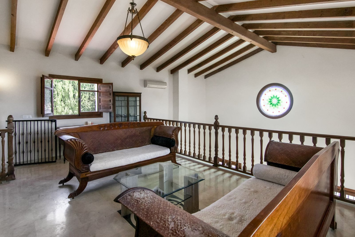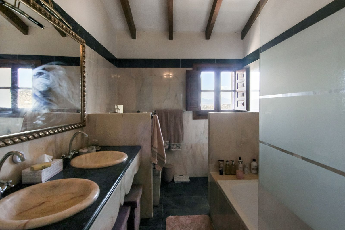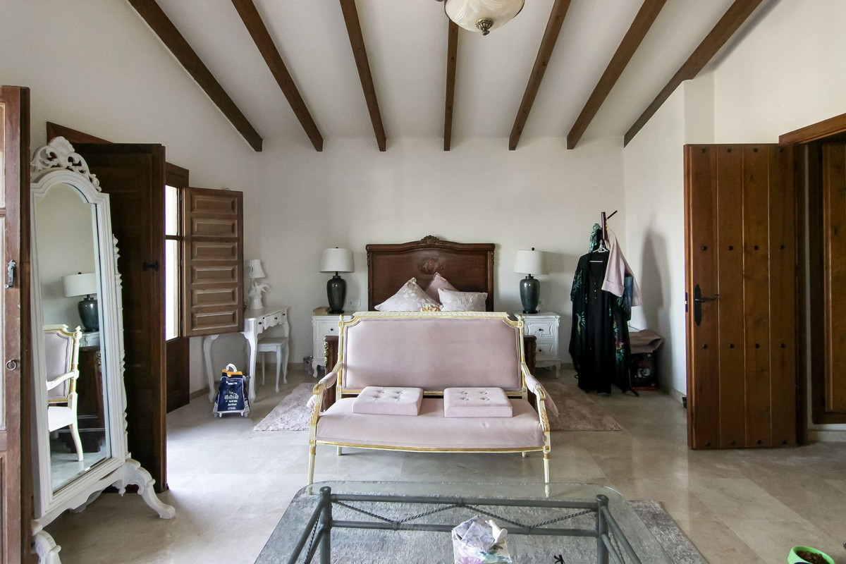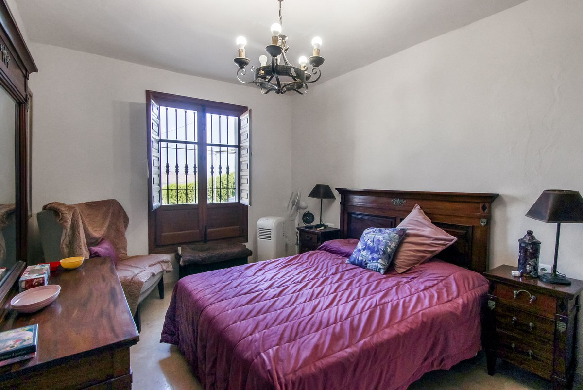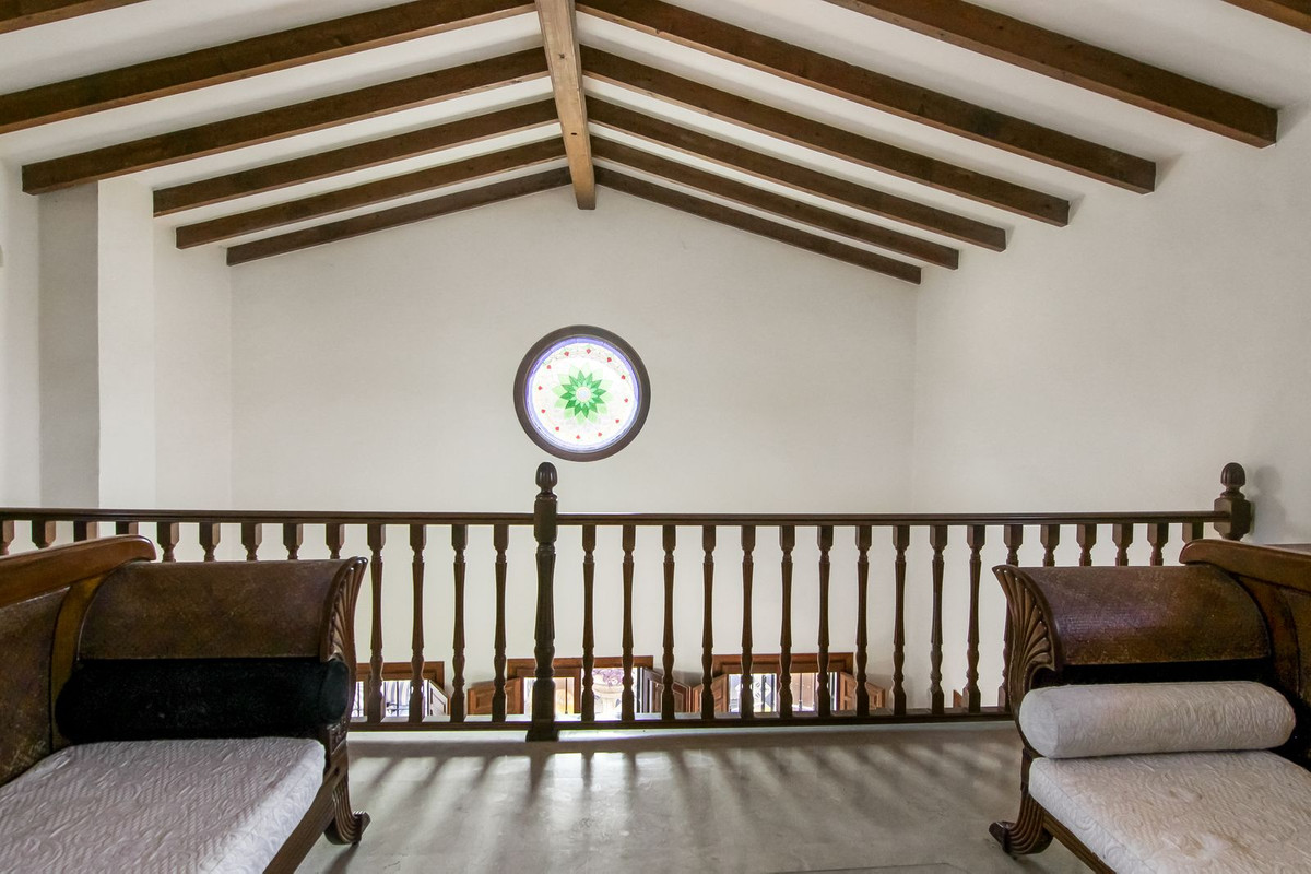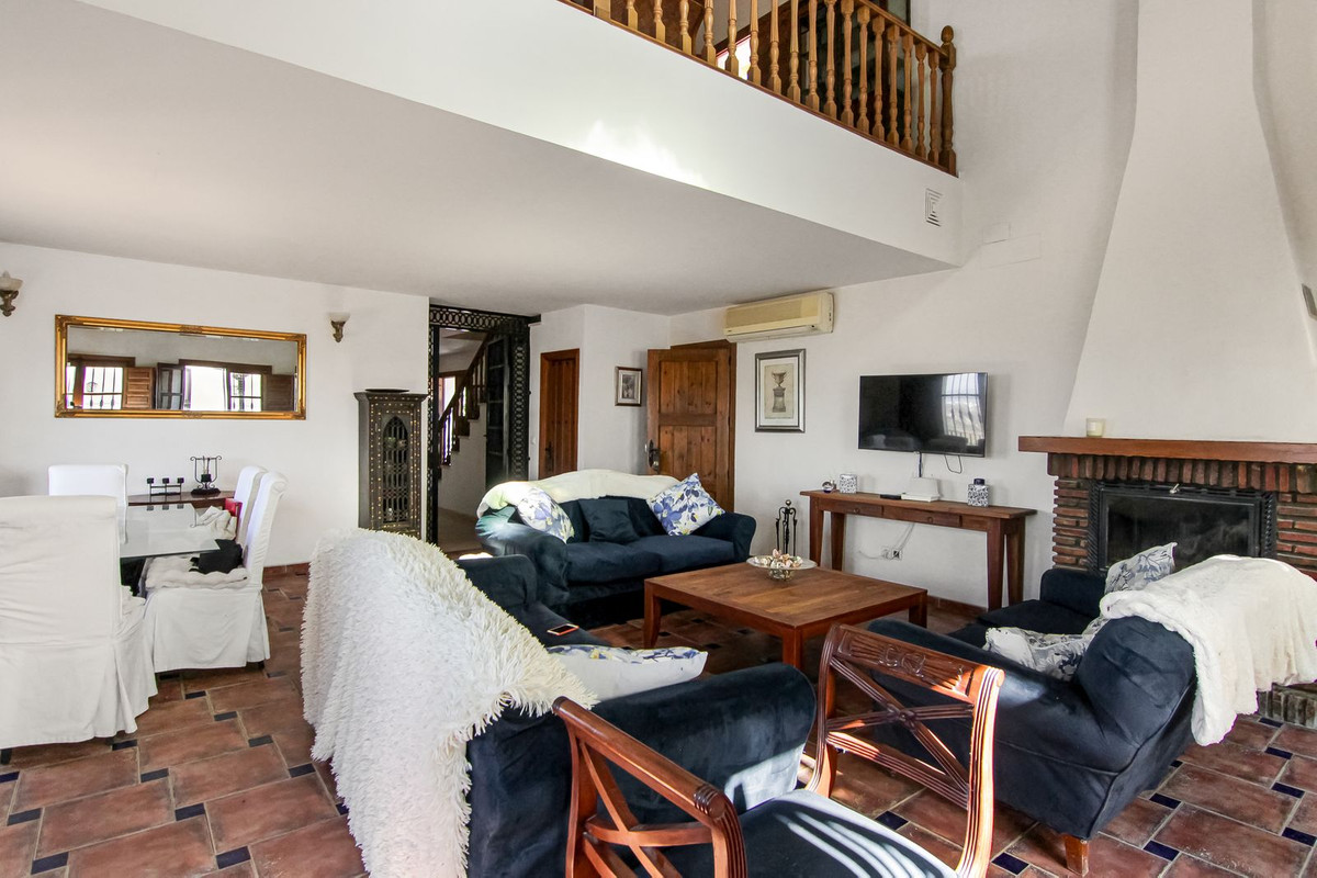 Living room is breathtaking, very spacious with high ceiling and big fireplace. Rustic style beautiful wooden framed windows, and indoor shutters, views to the countryside. A lot natural light and access to the outdoor Andalucian patio, where you can continue to the outdoor terrace. There is a potential and space to make a plunge pool. A lot of options for this idea.