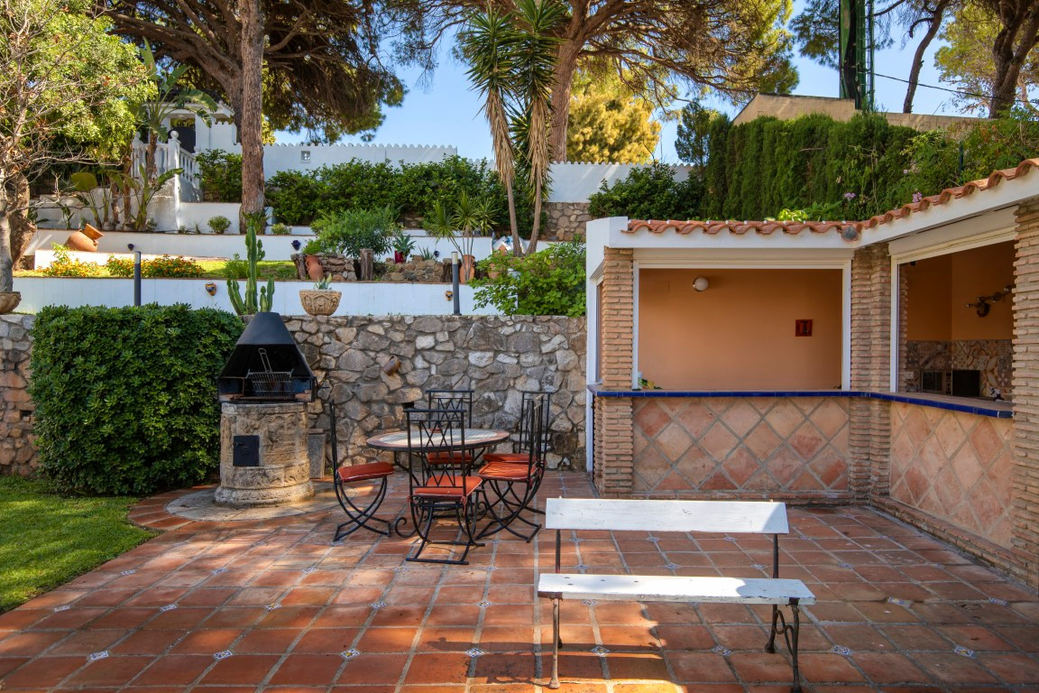 The exterior is a true Mediterranean retreat, with a lush, mature garden and water features surrounding a large private pool, complete with shower area, outdoor bathroom, and a fully equipped summer kitchen with BBQ, ideal for entertaining and enjoying the Costa del Sol climate. The property also includes a covered garage and additional on-site parking.