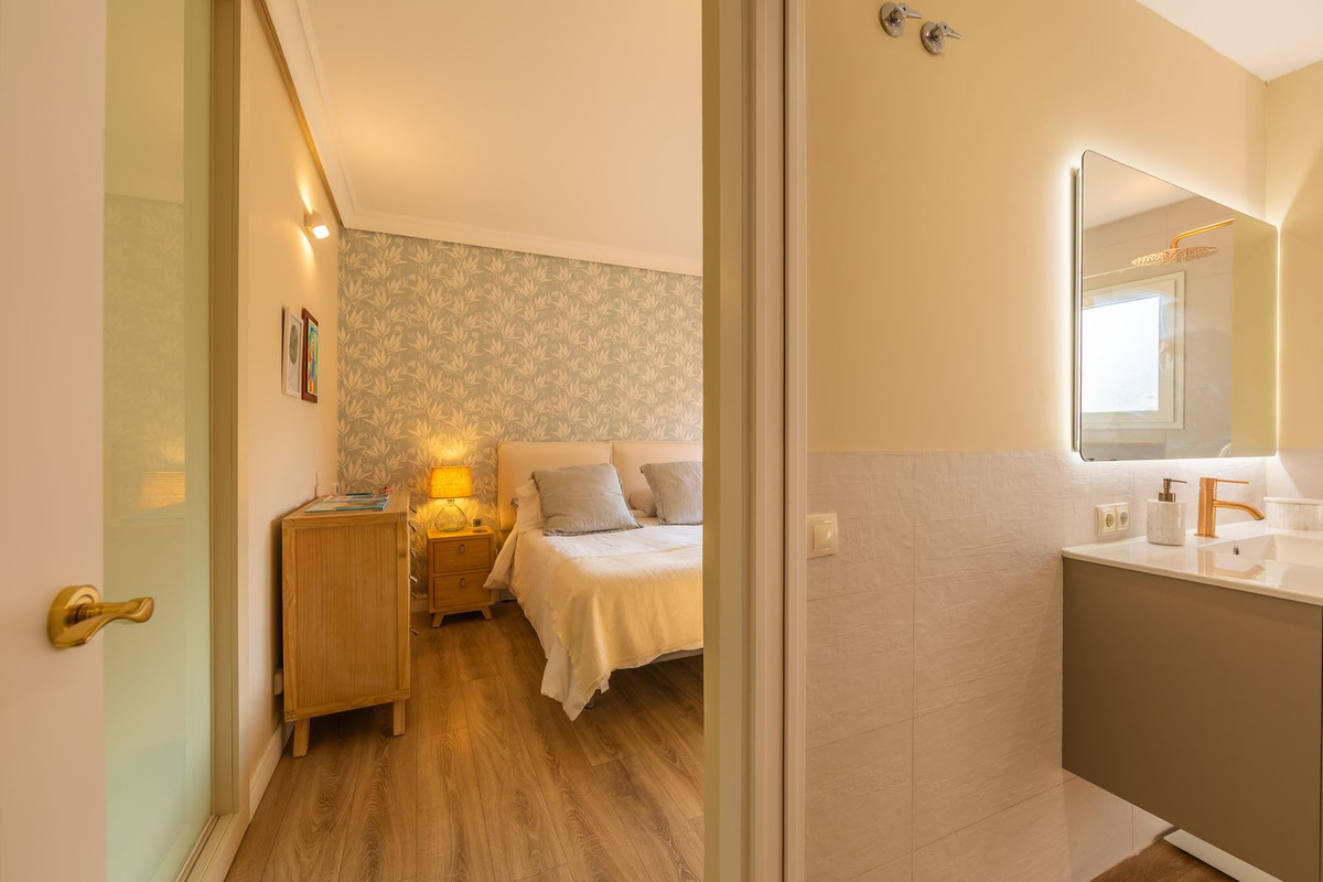 The property, built with high-quality materials, offers two spacious bedrooms, carefully redesigned lighting that enhances every corner, and a practical anti-limescale system for greater comfort. From the terrace, you can enjoy pleasant views of the lush gardens, the communal pool, and a partial sea view.