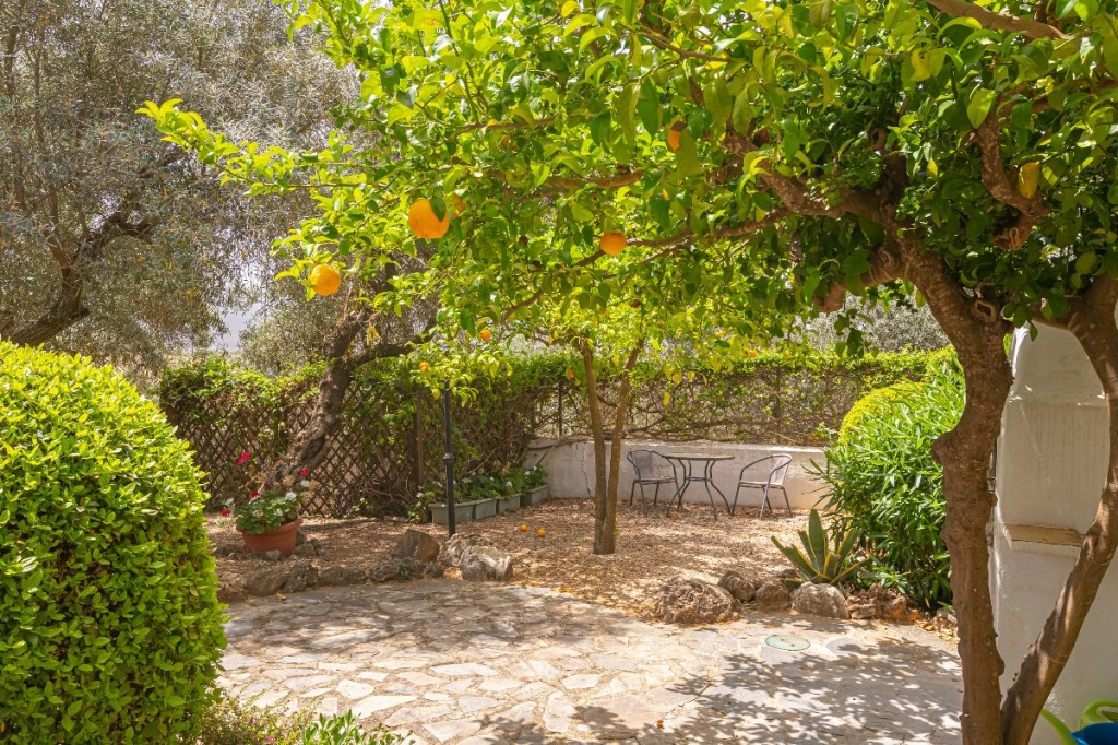 Vehicle entrance with parking for several vehicles and a fully fenced green area with olive trees. A picturesque entrance through a reception hallway leads to a beautiful interior courtyard that divides the 3 properties and also provides access to the pool and barbecue area.
