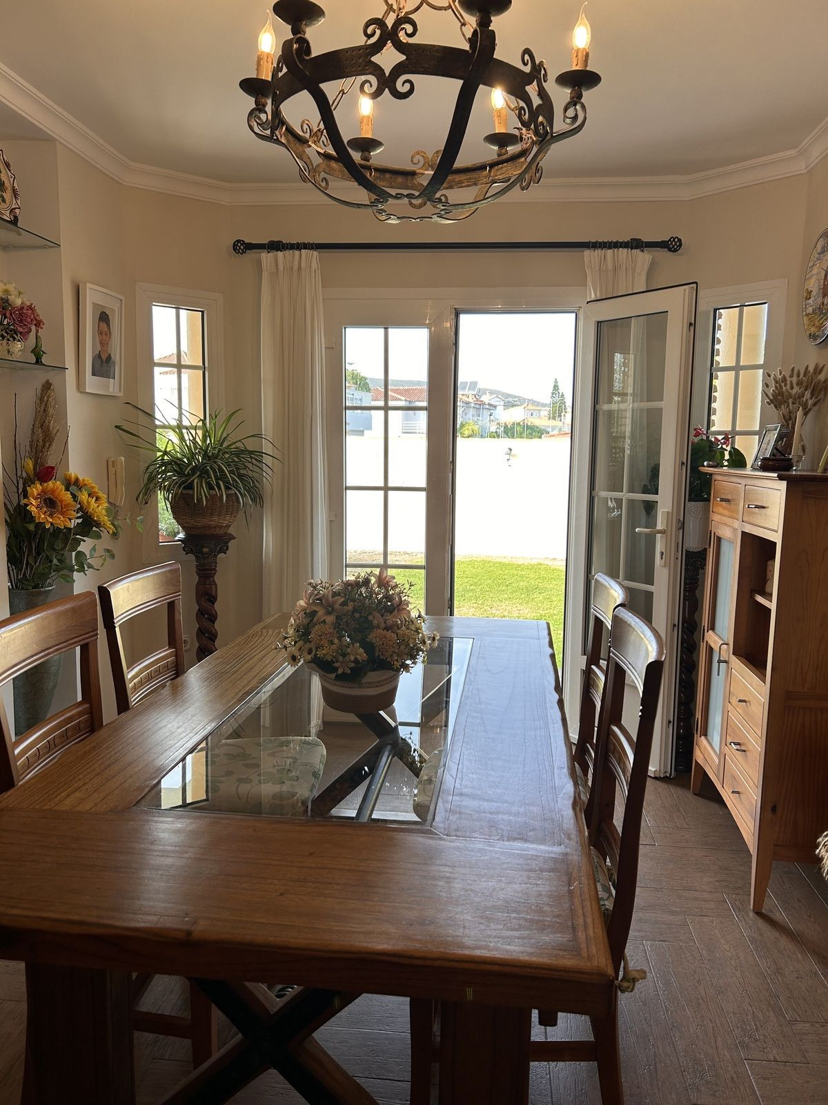 The property is surrounded by a large garden with fruit trees, creating a peaceful and private atmosphere. The outdoor dining area is perfect for gatherings with family and friends.