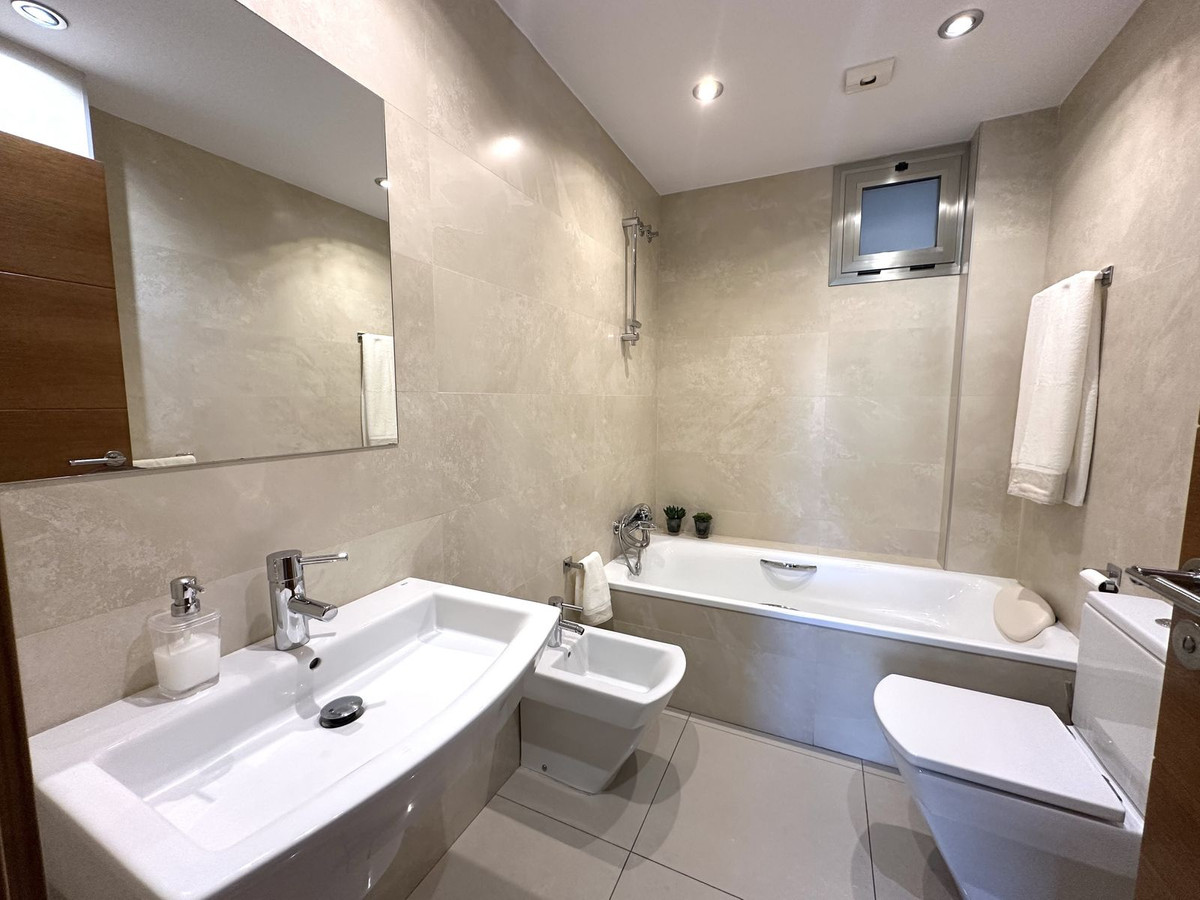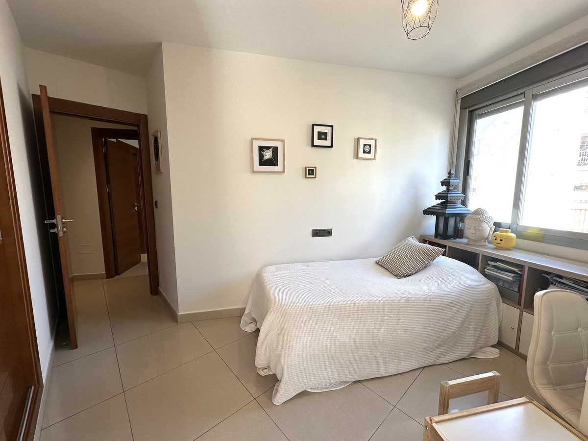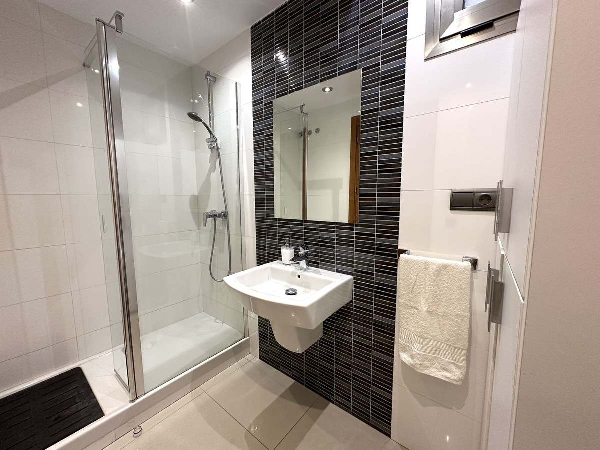 Depuis la terrasse, vous accédez directement à l'une des chambres bien agencées, créant une agréable connexion entre les espaces intérieurs et extérieurs. À côté de cette pièce se trouve la deuxième chambre. Ces deux pièces partagent une salle de bain avec douche. La spacieuse chambre principale dispose de sa propre salle de bain privative avec baignoire et climatisation. Les trois chambres disposent de placards intégrés et bénéficient de la lumière naturelle.
