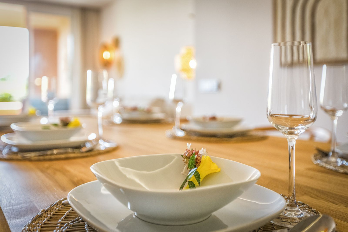 Inside you’ll find a bright living area that opens to a 57 m² partly covered terrace, a luxury kitchen, and a separate utility room. There are two bathrooms, one en-suite, and two good bedrooms. From the private terrace you look across to the main swimming pool.