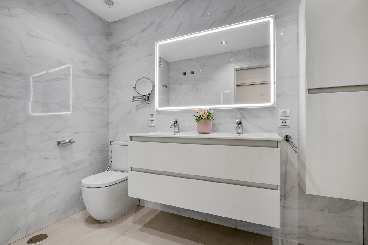 The master bedroom is generous in size and features an en-suite bathroom with double sink and walk-in shower, as well as three built-in wardrobes and access to the main terrace. The second bedroom, with white lacquered built-in wardrobes and a private balcony, is located next to a modern renovated bathroom with shower.