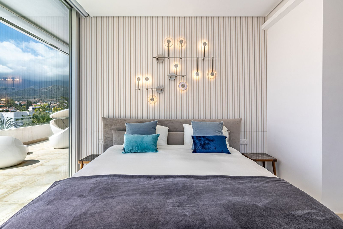 Upstairs, three elegant bedrooms enjoy private terraces with unobstructed panoramic views of the Mediterranean Sea and surrounding mountains. The master suite features a luxurious en-suite bathroom and a spacious walk-in wardrobe.