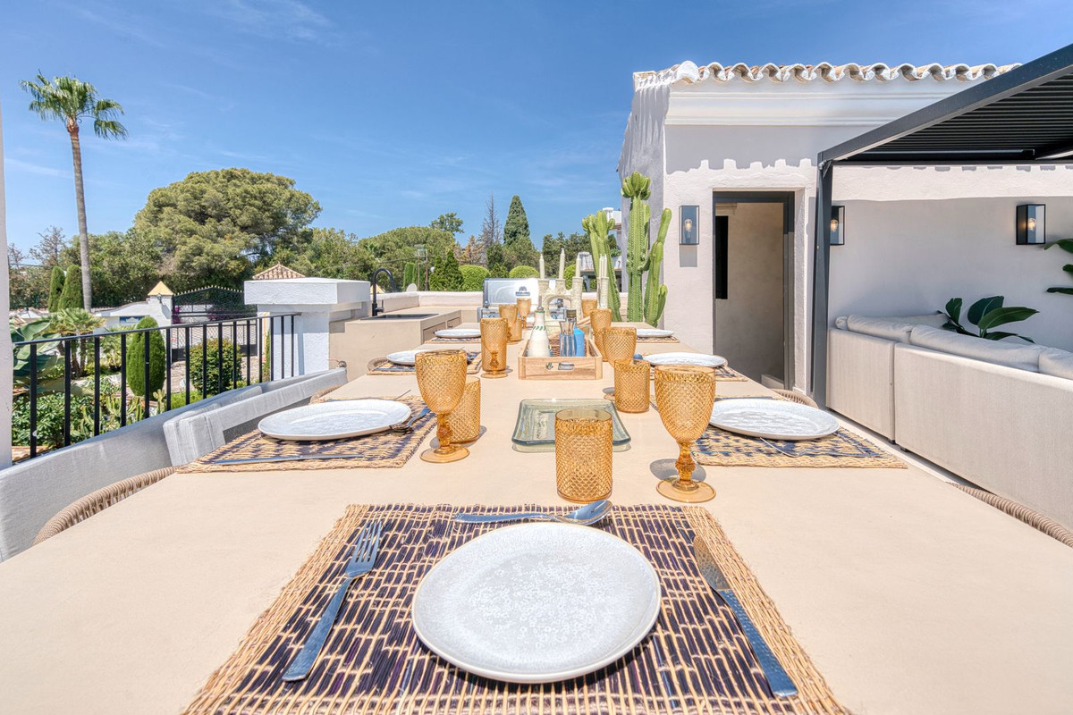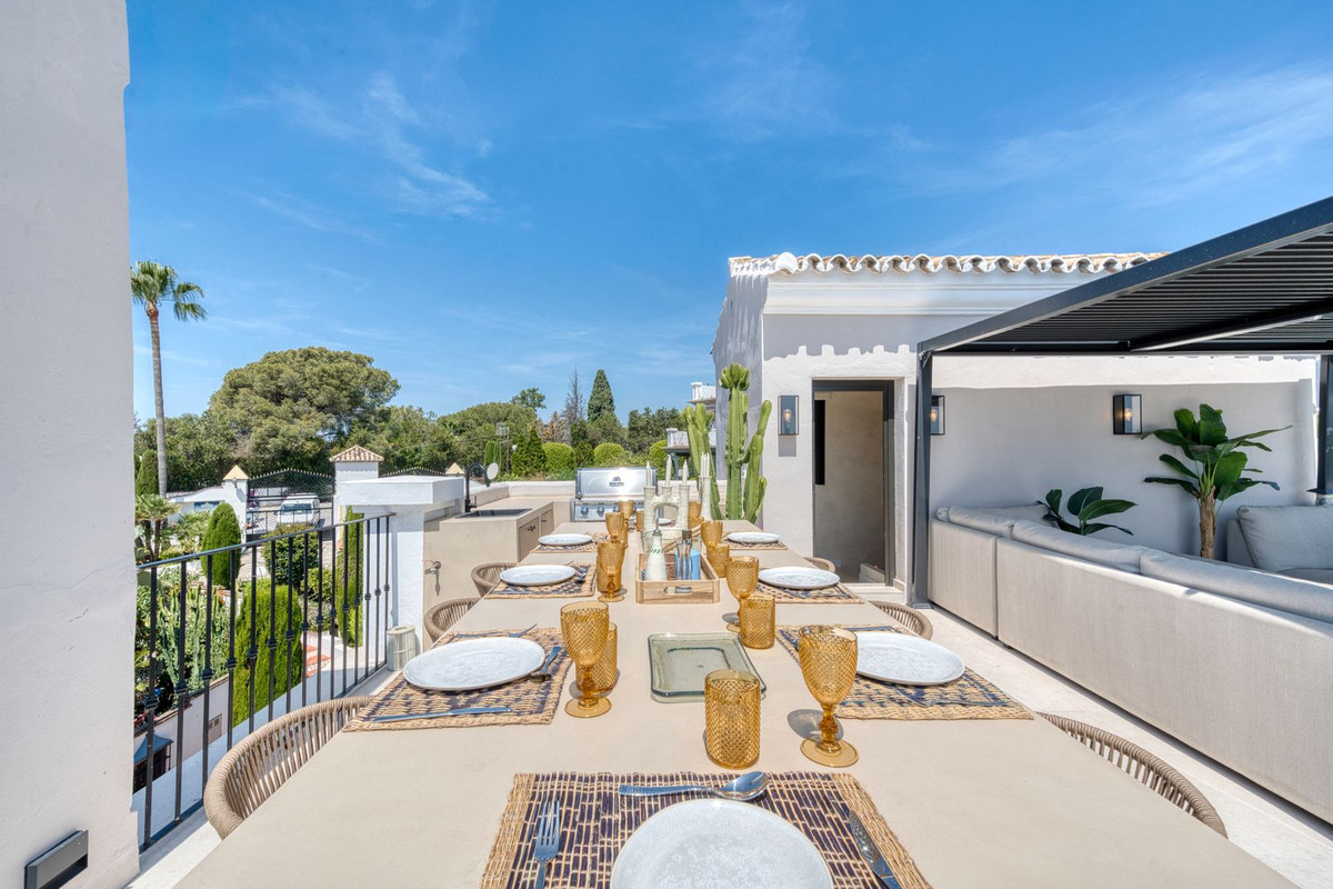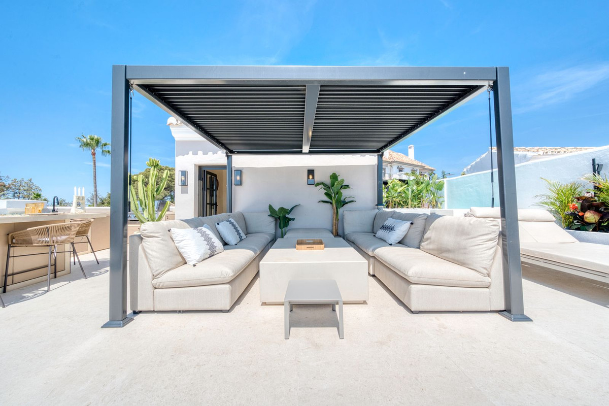 La terrasse sur le toit est tout simplement époustouflante, offrant une vue panoramique imprenable qui s'étend de La Concha aux toits du Puente Romano, en passant par la mer Méditerranée, et même Gibraltar et l'Afrique du Nord par temps clair. Conçue pour être habitée toute l'année, elle comprend un bassin chauffé, un espace barbecue et repas, ainsi qu'un salon ombragé pour se détendre, incarnant à merveille le style de vie marbellien, entre intérieur et extérieur. La propriété est proposée non meublée, mais le vendeur acceptera une offre incluant le mobilier dans la vente.