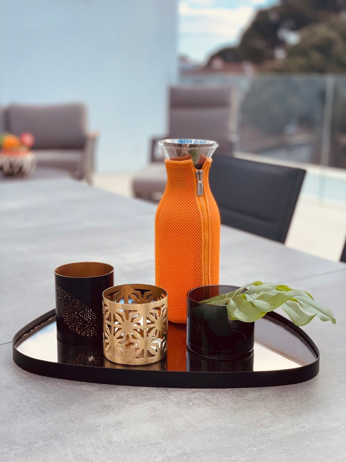 • Vaste terrasse de 70 m², magnifiquement aménagée pour recevoir – avec une table à manger pour 12 personnes, un coin salon élégant, des transats, un réfrigérateur à boissons/vins et des stores électriques.