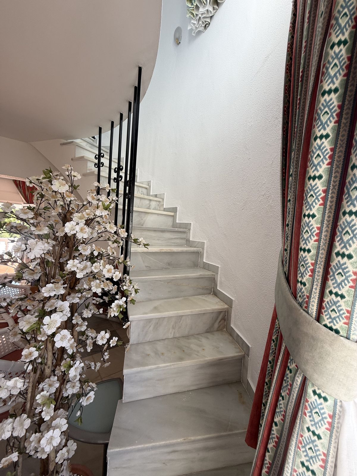 Au premier étage se trouvent la chambre principale et la salle de bains attenante récemment rénovée, offrant toutes deux une vue spectaculaire sur la mer.
