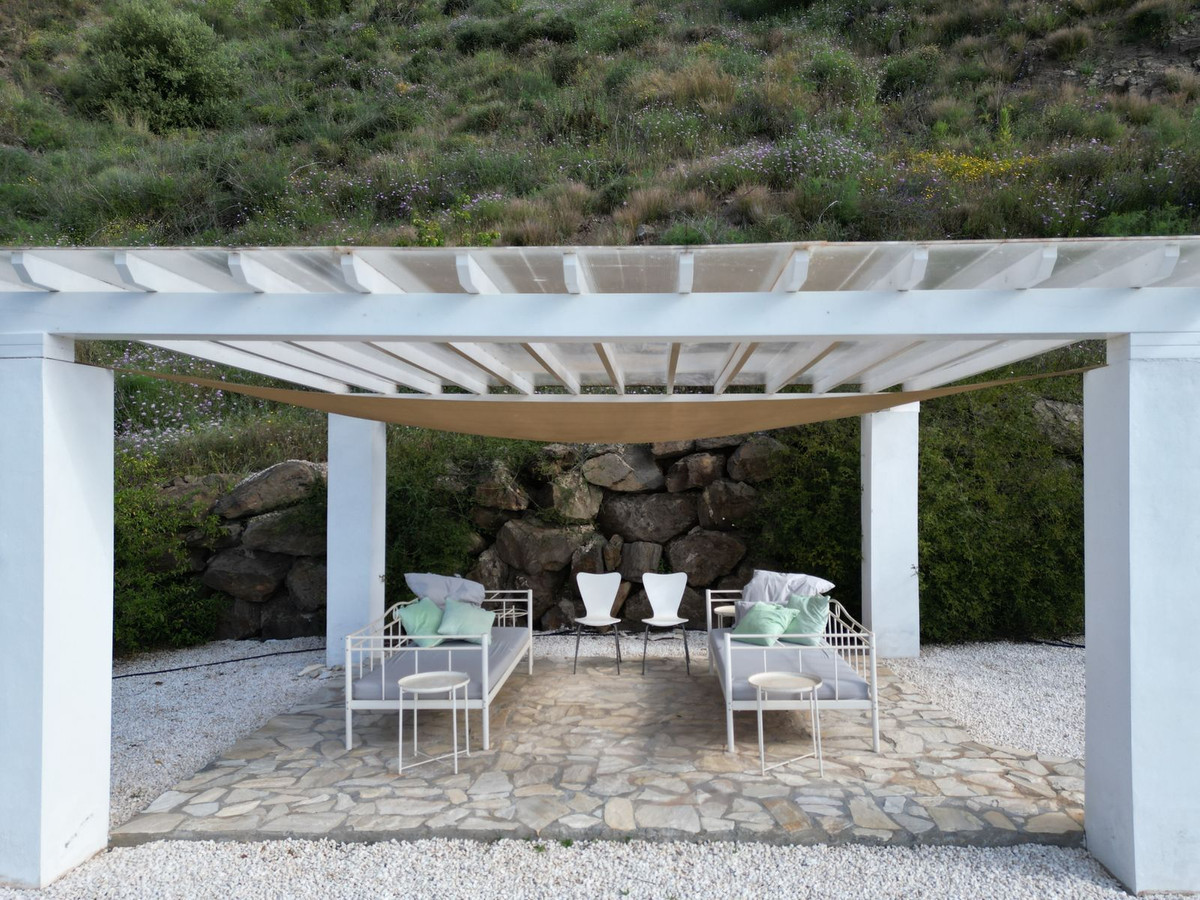 * Grande terrasse avec pergola au bord de la piscine - un endroit idéal pour se détendre et profiter de la vue panoramique sur Torre del Mar et Caleta de Vélez