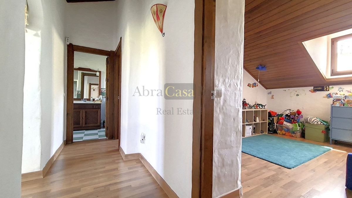 En entrant, on est immédiatement frappé par l'atmosphère chaleureuse et champêtre. Les portes en bois, typiques de l'Andalousie, sont réalisées sur mesure. L'élégant carrelage au sol est d'excellente qualité et les beaux plafonds à poutres apparentes complètent l'ensemble. Au rez-de-chaussée se trouve une salle de bain avec douche et toilettes. À côté, un grand cellier abrite notamment le lave-linge. Plus loin, au bout du couloir, se trouve une chambre spacieuse actuellement aménagée en salle de jeux pour enfants. À droite du couloir, on accède au séjour/salle à manger avec cuisine ouverte entièrement équipée. Cette pièce est agrémentée d'une grande cheminée. Les portes-fenêtres au centre de la pièce donnent sur la terrasse latérale.