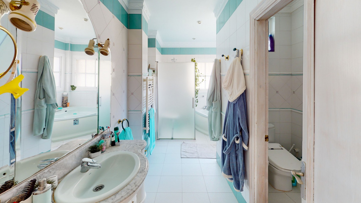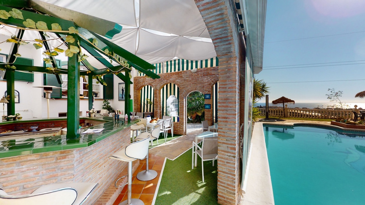 Vous avez toujours rêvé d'une grande et élégante demeure pouvant accueillir toute la famille ? Nous avons la propriété idéale pour vous. Cette villa d'environ 500 m² est divisée en deux maisons jumelées. Chaque logement dispose de sa propre entrée et de cinq niveaux. De plus, chaque partie de la maison comprend une dépendance pour les invités. Parfaite pour une famille nombreuse, un investissement locatif ou un club de tennis, les possibilités sont nombreuses. Un sous-sol spacieux et commun, avec buanderie, rangements et accès à l'extérieur, relie les deux parties de la villa. Des escaliers séparés mènent au rez-de-chaussée. De part et d'autre, on trouve l'entrée principale, des toilettes invités et un vaste séjour-salle à manger avec cuisine ouverte et une vue imprenable sur la côte. Le premier étage comprend une pièce pouvant servir de bureau et la suite parentale avec salle de bains privative, dressing et petite terrasse. Au deuxième étage, les duplex s'ouvrent sur une cuisine commune avec accès à l'étage supérieur. Un large escalier commun mène au dernier étage de la propriété, où se trouvent deux chambres avec salles de bains privatives. Les deux annexes indépendantes, situées au rez-de-chaussée, comprennent un espace de vie ouvert avec chambre, kitchenette et salle de bains. Le point fort de la propriété est sans conteste son espace extérieur. Juste à côté de la villa se trouve un bar couvert avec des sièges, idéal pour les réceptions été comme hiver. Pour se rafraîchir lors des chaudes journées d'été, plongez dans la piscine accueillante ou détendez-vous sur un transat face à la mer. Derrière une clôture recouverte de lierre, un court de sable ravira les amateurs de tennis. Au-dessus du court se trouve un bâtiment abritant un sauna, des douches et des toilettes. La propriété dispose de deux grands parkings. L'un, au niveau supérieur, donne accès à la cuisine commune et au sauna. L'autre, avec un abri voiture, se situe au niveau inférieur, où se trouvent les entrées principales des maisons jumelées, ainsi que la piscine et le court de tennis. La propriété est autonome grâce à son propre système d'approvisionnement en eau et d'assainissement. Un puits de 15 000 litres alimente le complexe et le court de tennis. Nous sommes ravis de pouvoir vous présenter prochainement cette propriété de rêve, en personne ou en visite virtuelle. Car ce lieu est unique, à l’image de notre Axarquía. En Andalousie. Sur la Costa del Sol. Ici, sous le soleil…