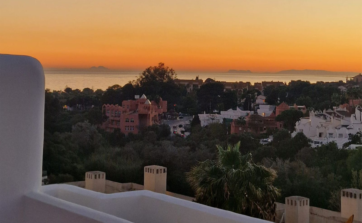 This is a great semi-detached house located within a complex of houses in the Cabopino, Artola area by Cabopino Golf and just a three minutes drive from Cabopino Marina and beach. The house itself is on three levels with a private garden on the lower level, a terrace on the middle floor and then with the upper level feeling like a penthouse with an even larger terrace and even better sea and coastal views. The property has a well built modern feel with beige marble throughout. The complex enjoys a community pool. Cabopino is a top location in East Marbella with some of the best beaches on the Costa del Sol.