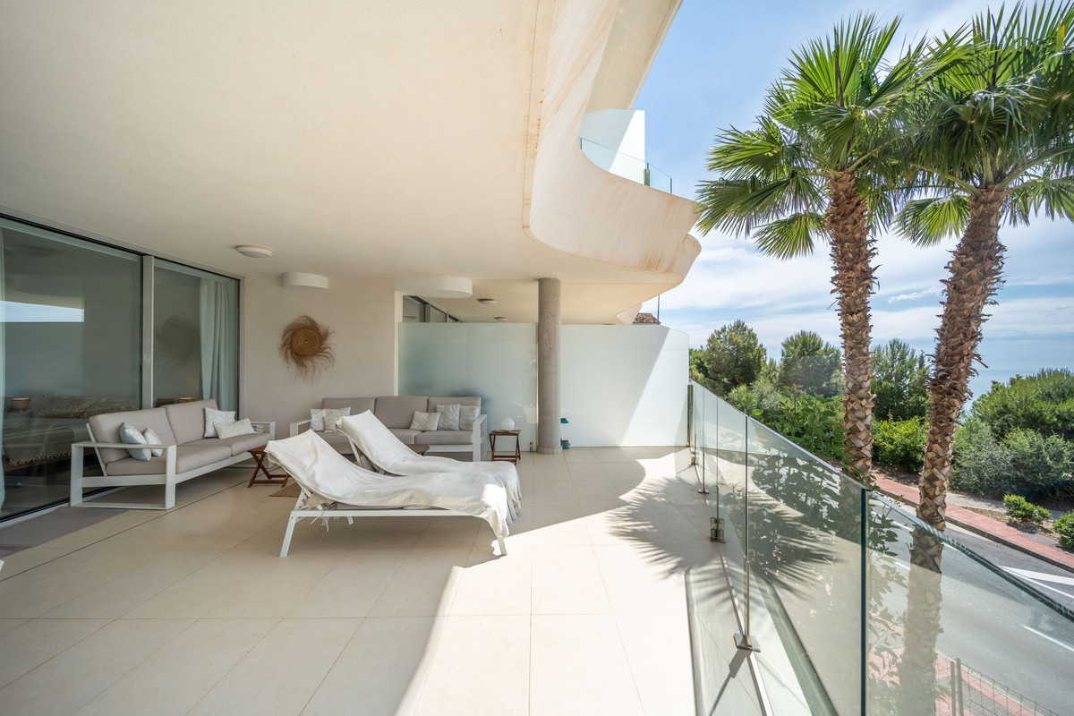 Amazing south facing apartment, located in the exclusive complex of Stupa Hills. Consists of 2 bedrooms, 2 bathrooms, open plan kitchen fully furnished and equipped with electricial appliances and access to a spacious laundry area with washing machine and dryer. Spacious living-dining room with access to a large terrace of 42m2 with sea views. Air conditioning hot and cold, video intercom, electric blinds in secondary bedroom, domotic system, pre-installation alarm system, built-in wardrobes. Includes two parking spaces and one storage room.