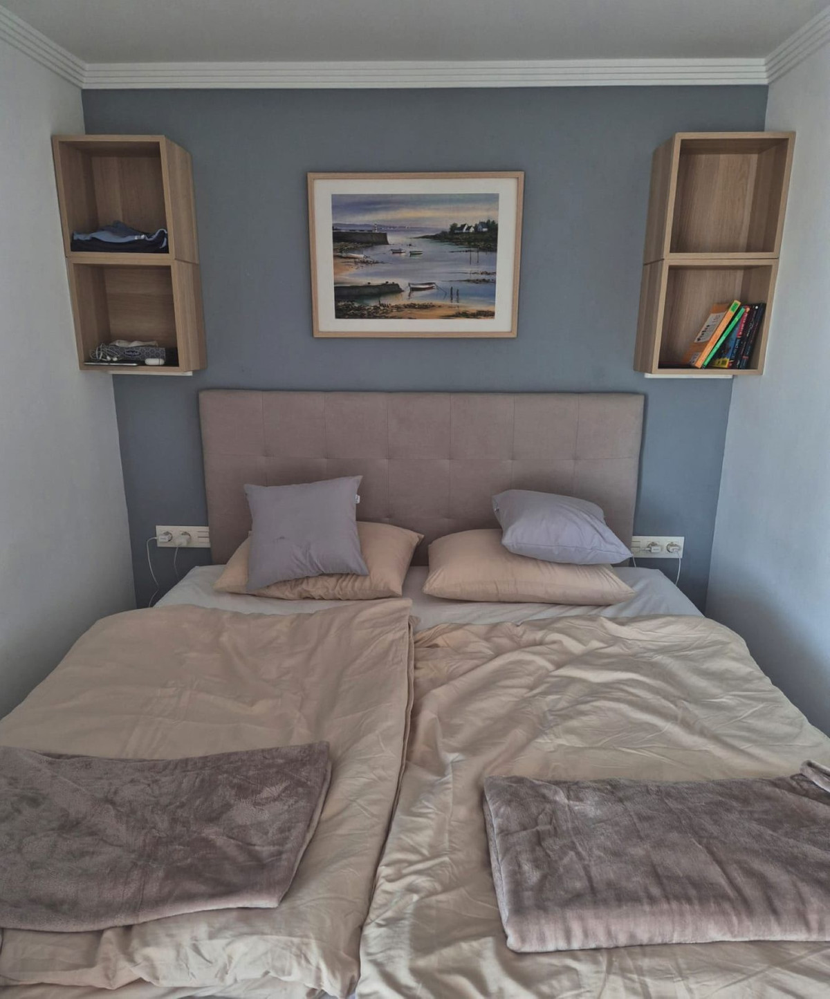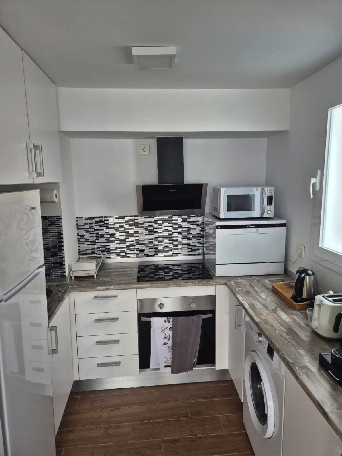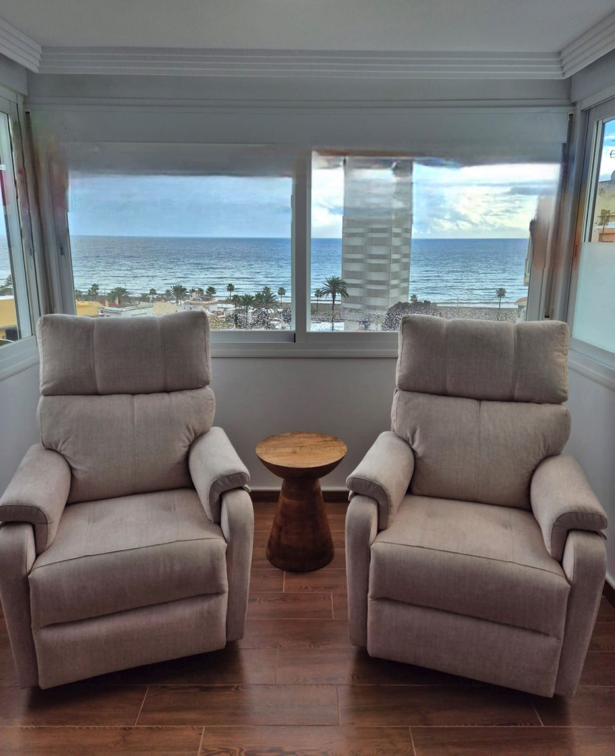 Spanning 40 m² of bright, south-east-facing space on the sixth floor with convenient lift access, this apartment has been meticulously refurbished for modern comfort: new electrical and plumbing systems, a high-efficiency air conditioning unit, luxurious electric blinds on all windows, a premium 180 x 200 cm box-spring bed, a fully equipped kitchen with top appliances, a redesigned bathroom with underfloor heating, a secure door, and a pre-installed alarm system. Relax in ultimate style with two electric reclining armchairs, soaking up the stunning panoramic sea views that flood the space with natural light. The building's rooftop terrace is available for residents, enhancing outdoor enjoyment.
