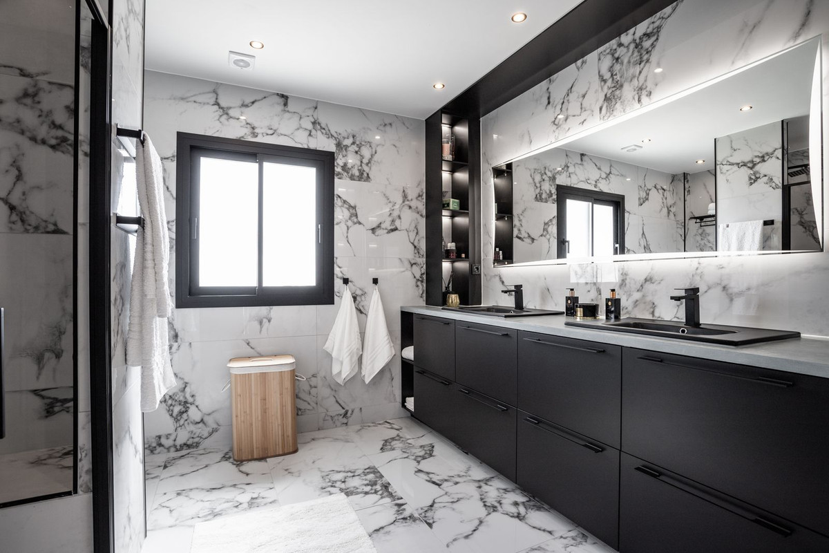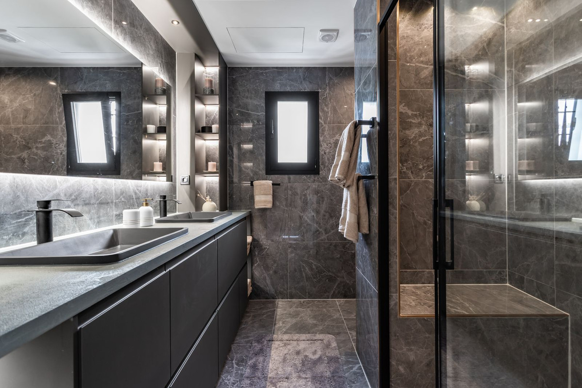 The villa offers four spacious bedrooms, three luxurious bathrooms, and a guest WC. The open-plan layout and impressive five-meter-high ceilings in the living room create a bright and airy atmosphere, enhanced by large windows that flood the interior with natural light and seamlessly blend indoor and outdoor living.
