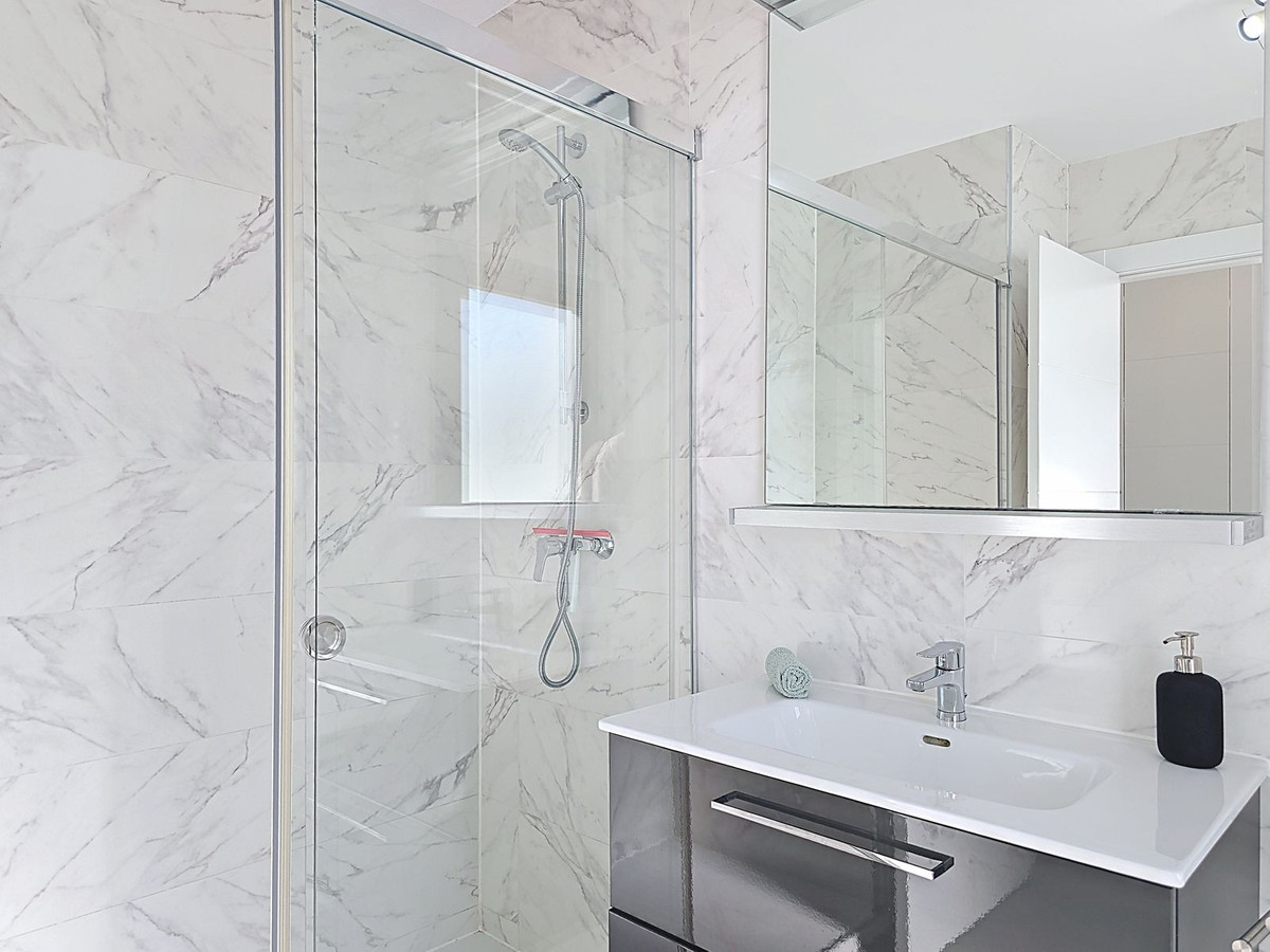 • Salle de bains attenante avec douche spacieuse, lavabo, WC, bidet et accès à la terrasse