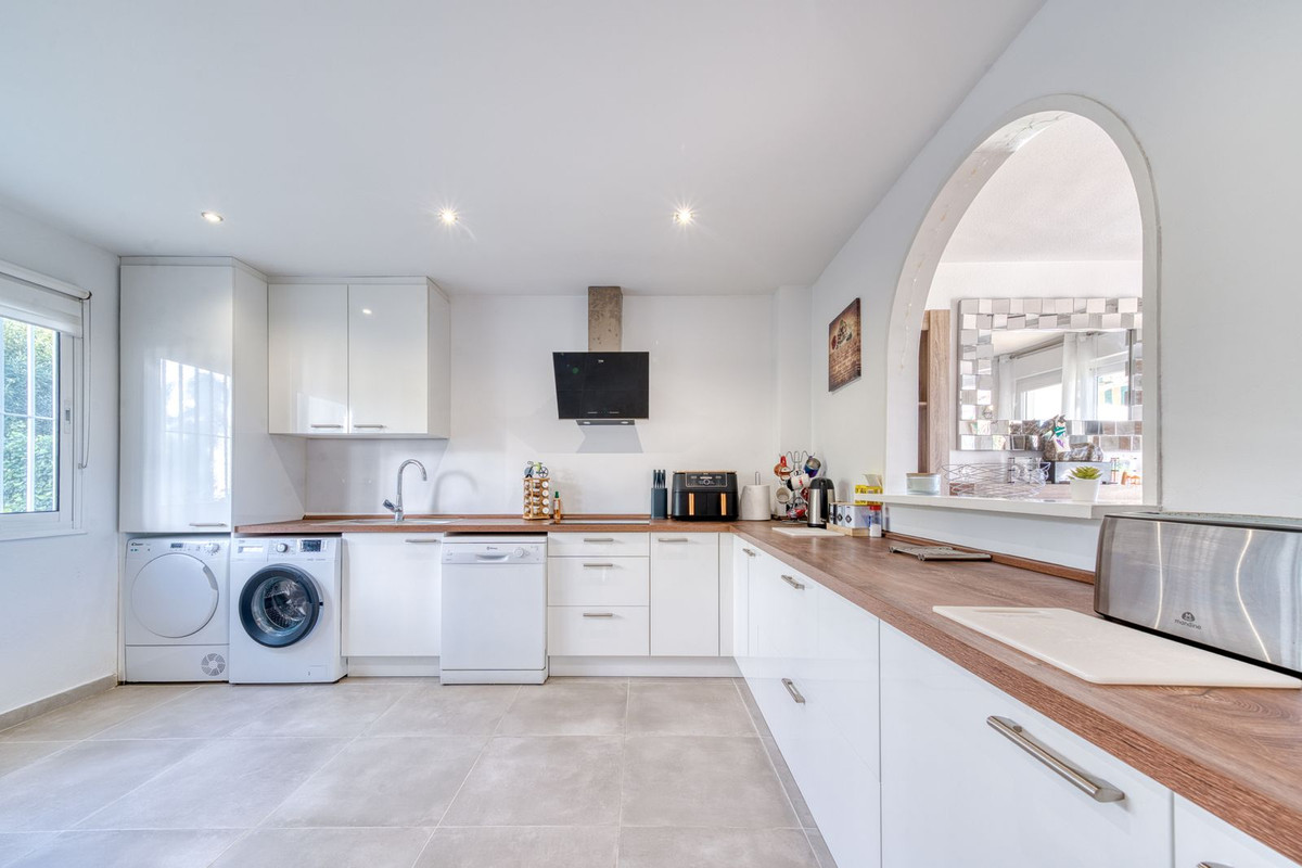 Le rez-de-chaussée abrite une cuisine flambant neuve, équipée d'électroménagers haut de gamme, de placards élégants et de plans de travail en pierre, qui s'ouvre harmonieusement sur un séjour lumineux et spacieux. De grandes fenêtres neuves inondent l'intérieur de lumière naturelle et créent une atmosphère fraîche et accueillante. Chacune des trois chambres est dotée d'élégants placards intégrés, tandis que les salles de bains rénovées présentent des équipements contemporains, des finitions haut de gamme et un éclairage soigné. La maison est entièrement climatisée pour un confort optimal toute l'année. Un atout majeur est l'installation solaire photovoltaïque qui permet de réduire les coûts énergétiques et témoigne d'une approche réfléchie et durable du mode de vie moderne. Les espaces extérieurs sont tout aussi impressionnants, avec un jardin privatif idéal pour des matins paisibles et des soirées relaxantes, ainsi qu'une généreuse terrasse sur le toit offrant une vue dégagée et une agréable brise marine. La grande piscine commune propose une expérience digne d'un complexe hôtelier dans un cadre résidentiel paisible.