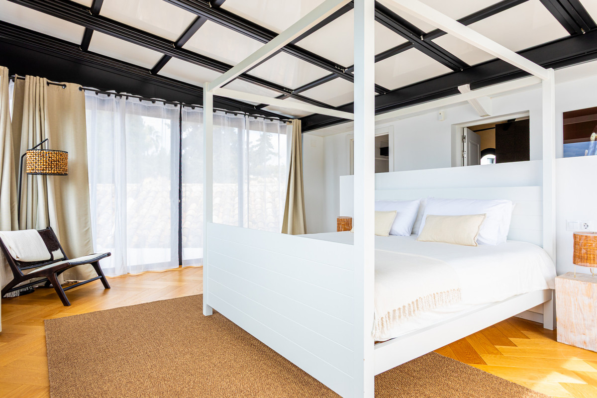 Au cœur de la maison se trouve une cuisine ultramoderne et entièrement équipée, qui s'ouvre harmonieusement sur un vaste séjour/salle à manger, idéal pour le quotidien comme pour recevoir avec élégance. Depuis le salon, accédez à une terrasse couverte, parfaite pour se détendre ou dîner en plein air. Au bout de la terrasse, un escalier mène à un spectaculaire solarium sur le toit, où se trouve une sixième chambre double récemment aménagée. Ce havre de paix privé dispose d'une salle de bains contemporaine et d'un toit rétractable unique, idéal pour admirer les étoiles sous le ciel étoilé.
