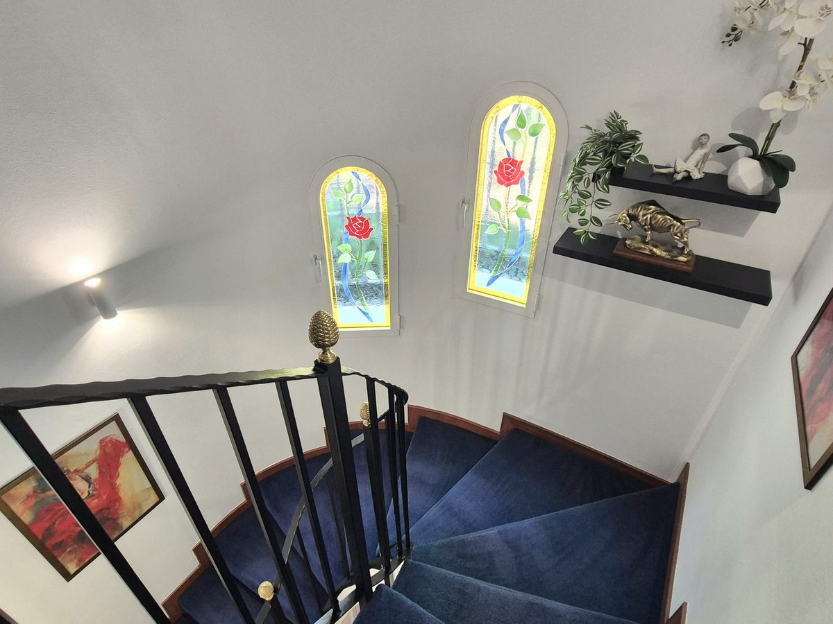 Curved staircase to upper floor. To the right of the stairs is the study/bedroom/office. Further along the landing which has A/C unit is the family bathroom with toilet, bidet, sink in housing unit with storage and bath with shower, radiator for central heating, tilt and turn window and storage cupboard.