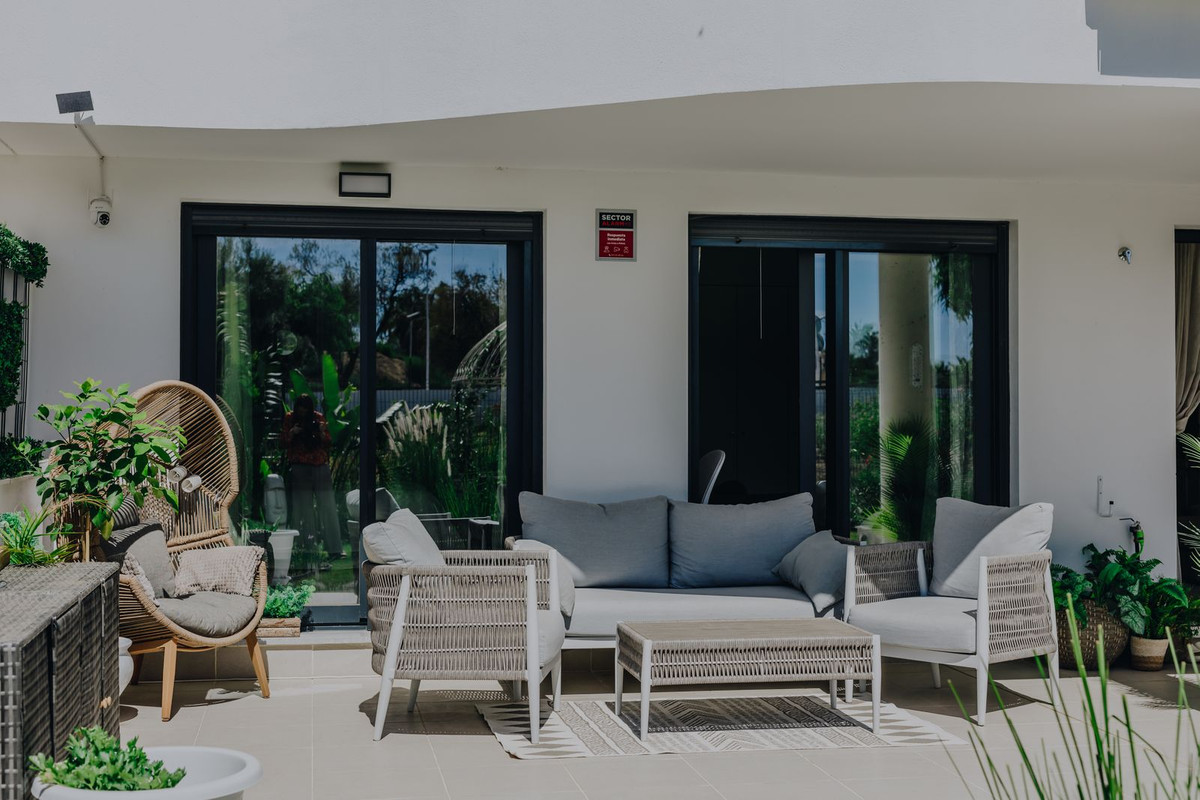 Appartement moderne de 2 chambres au rez-de-chaussée avec un magnifique jardin, situé dans la résidence de standing Aranya à Selwo, Estepona. Ce bien neuf, exposé plein sud et vendu entièrement meublé, offre des intérieurs lumineux et un design contemporain. L'espace de vie ouvert donne directement sur une spacieuse terrasse privative et un grand jardin, créant un cadre idéal pour les repas en plein air, la détente et les réceptions.