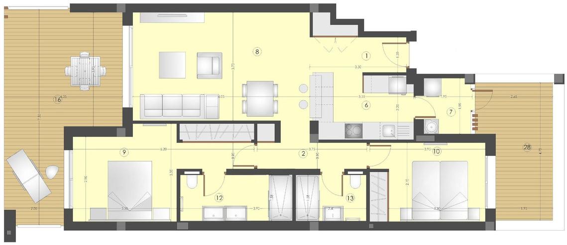La cuisine de luxe entièrement équipée allie fonctionnalité et élégance, avec des appareils haut de gamme tels qu'une plaque à induction, un four et un micro-ondes intégrés, un lave-vaisselle et un réfrigérateur-congélateur. Le bar à petit-déjeuner s'ouvre sur la pièce de vie principale, idéale pour recevoir. Une buanderie séparée abrite le système hybride aérothermique à eau et au sol, un lave-linge et des rangements supplémentaires. De là, vous accédez directement à la charmante terrasse exposée est, idéale pour prendre votre café du matin et admirer le lever du soleil.