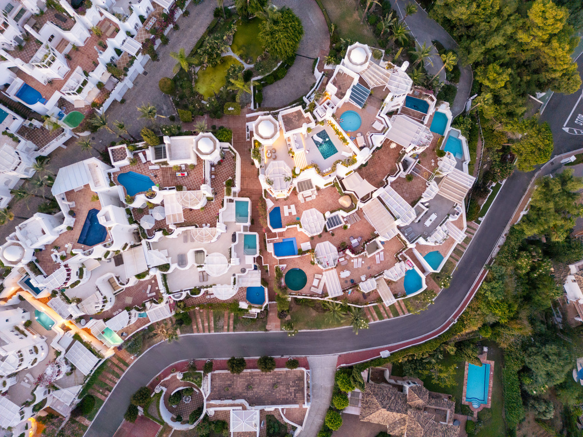 Le quartier de Jardines Colgantes, également connu sous le nom de Marbella Hill Club, est réputé pour son exclusivité, son intimité et son urbanisme à faible densité. De larges avenues arborées et des jardins paysagers soignés créent une atmosphère paisible, tandis que sa situation en hauteur garantit aux résidents sécurité et vues imprenables. Les propriétés du quartier, allant des villas traditionnelles de style andalou aux résidences contemporaines, composent un paysage architectural à la fois élégant et diversifié.