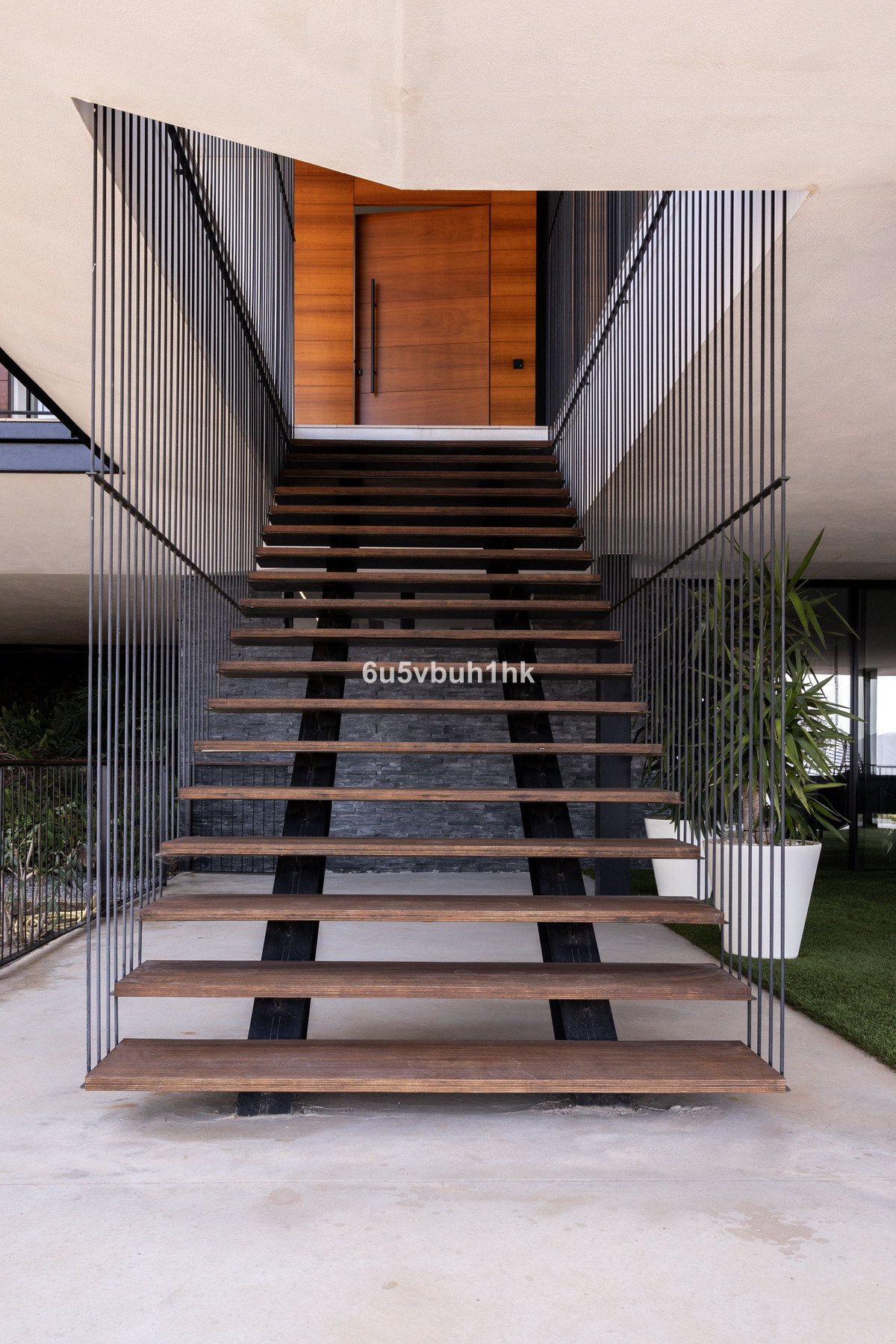 La maison s'organise autour d'une plateforme d'observation surélevée, légèrement en retrait au sommet d'une colline. Sa conception est une réponse à la fois au terrain et aux vues imprenables qui l'entourent. Le terrain est orienté sud et ouest, offrant des vues sur la mer, les magnifiques montagnes et les superbes pins.