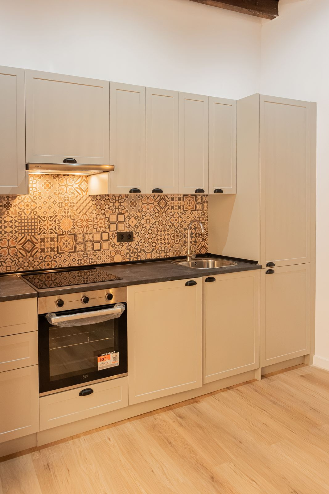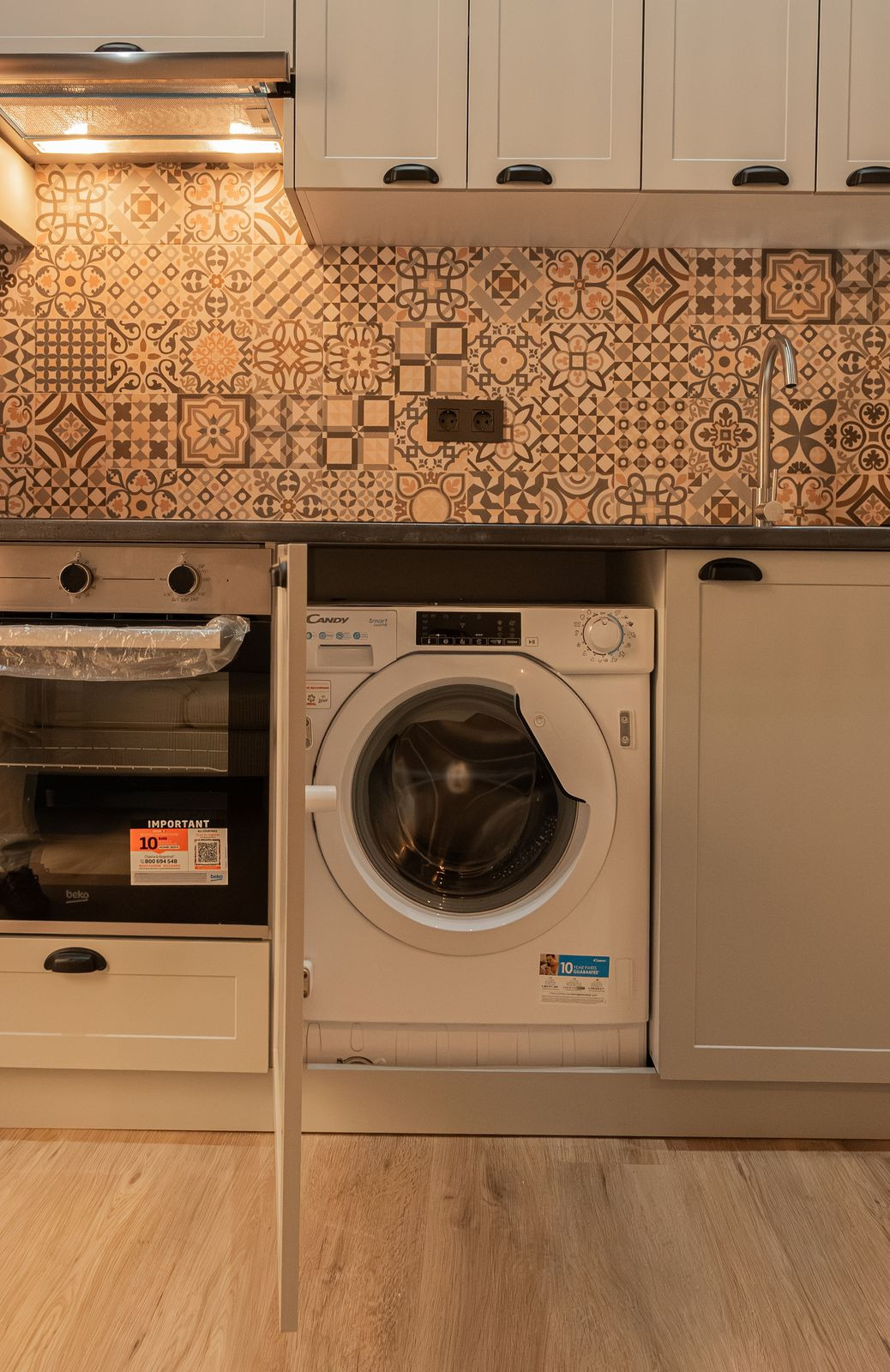La cuisine, entièrement neuve et conçue sur mesure pour ce bien, comprend une hotte aspirante, une plaque de cuisson vitrocéramique, un four, un lave-linge séchant et un réfrigérateur intégré — le tout neuf et jamais utilisé, et inclus dans le prix. Le mobilier du salon et de la chambre est également neuf et jamais utilisé.