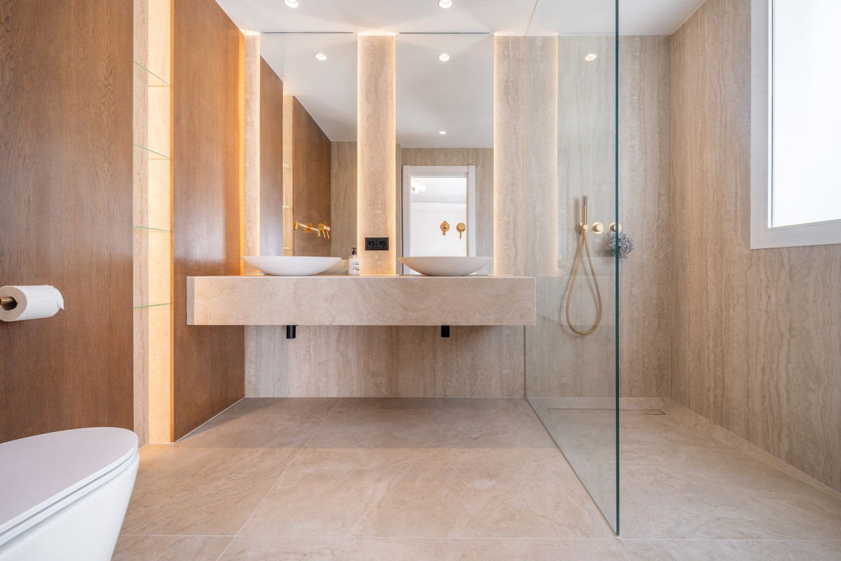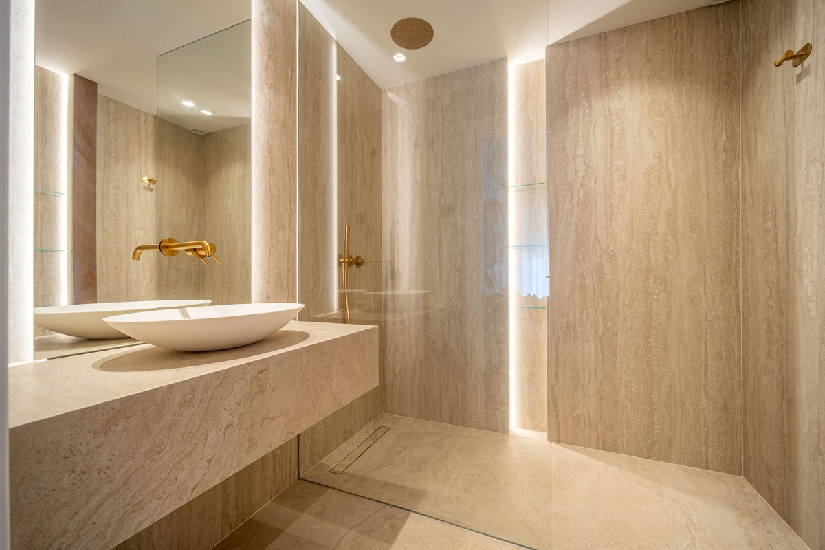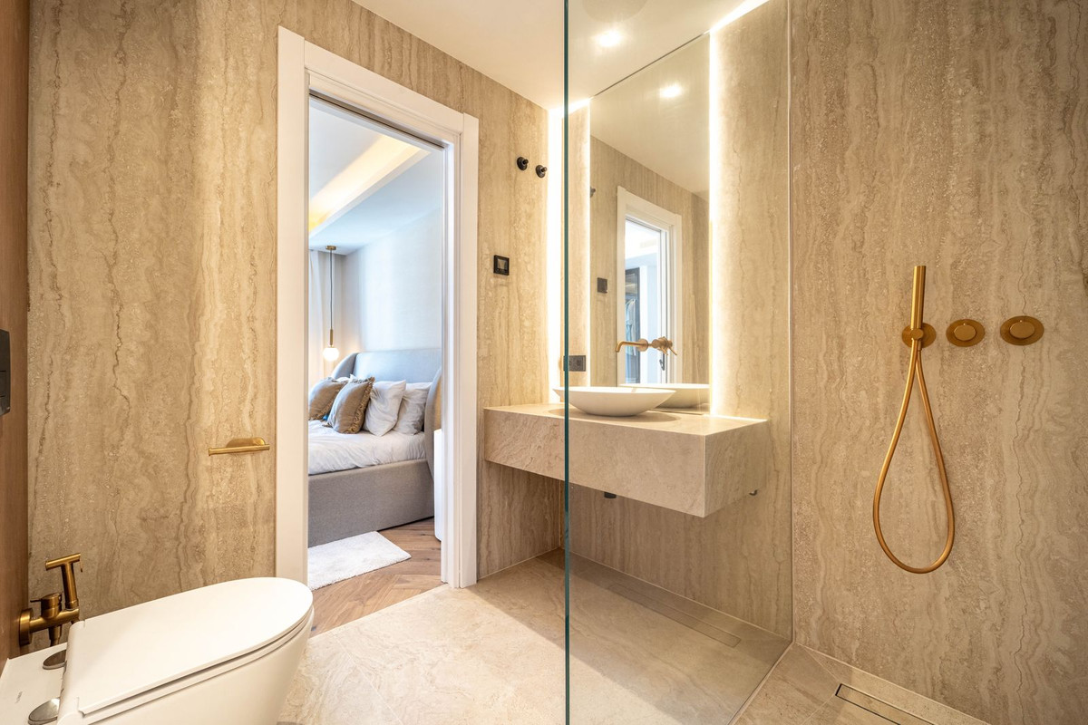En montant l'escalier, vous découvrirez un vaste palier orné d'un magnifique parquet en chêne à chevrons et d'une rampe sur mesure. À gauche se trouve la chambre d'amis, une pièce aux proportions harmonieuses dotée d'armoires vitrées rétroéclairées sur mesure, dont l'intérieur est doublé de lin, assorti au papier peint de la chambre. Cette chambre dispose d'une salle de bains privative entièrement carrelée de travertin, avec des niches rétroéclairées et des étagères en verre suspendues, un chauffage au sol et un meuble vasque assorti, surmonté d'un miroir rétroéclairé sur mesure.