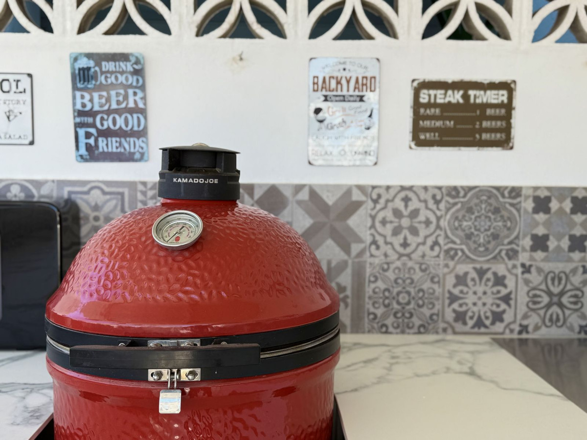La terrasse de 98 m², de plain-pied avec l'appartement, prolonge l'espace de vie vers l'extérieur. Elle comprend une cuisine d'été entièrement équipée avec barbecue, évier et réfrigérateur, un coin repas pour six personnes, un espace bar, une douche extérieure et même une salle de sport privée. Une partie de la terrasse est vitrée et aménagée en bureau climatisé, qui peut également servir de chambre d'amis supplémentaire.