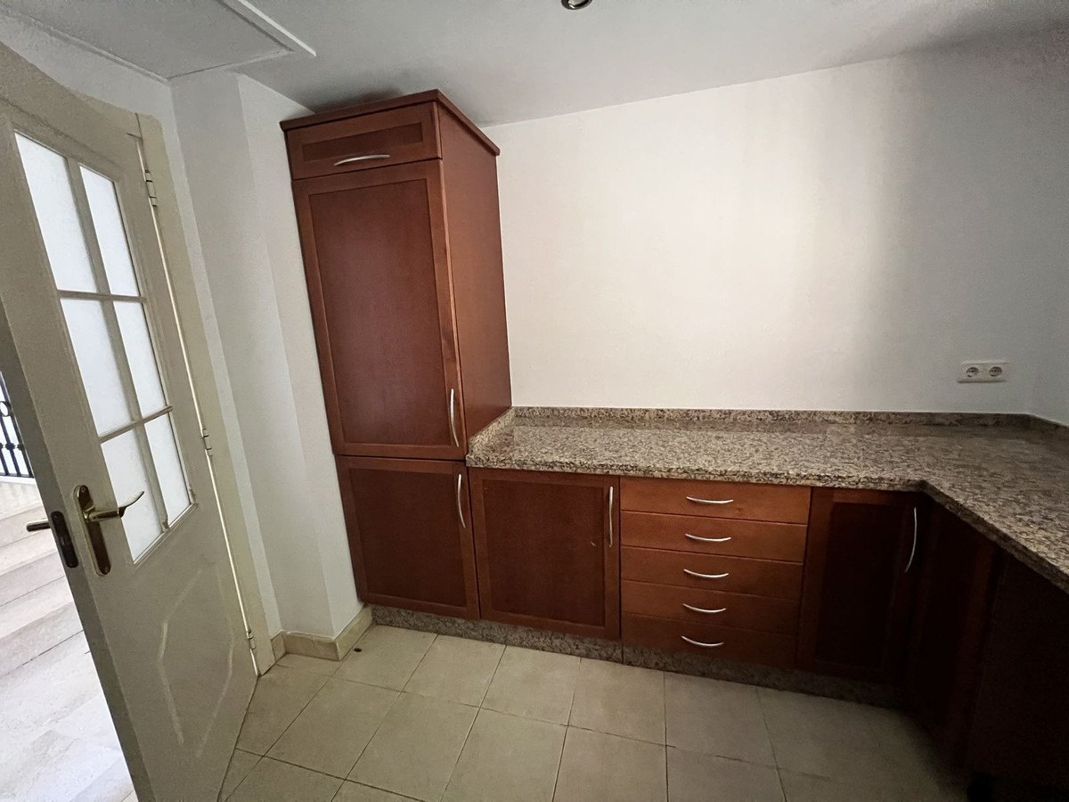 On the ground floor, there is a spacious living-dining area with great natural light, an independent kitchen with the possibility of being opened up to the living room with a minor renovation, a guest toilet, and a separate utility/laundry room. The property features centralized air conditioning and marble flooring.