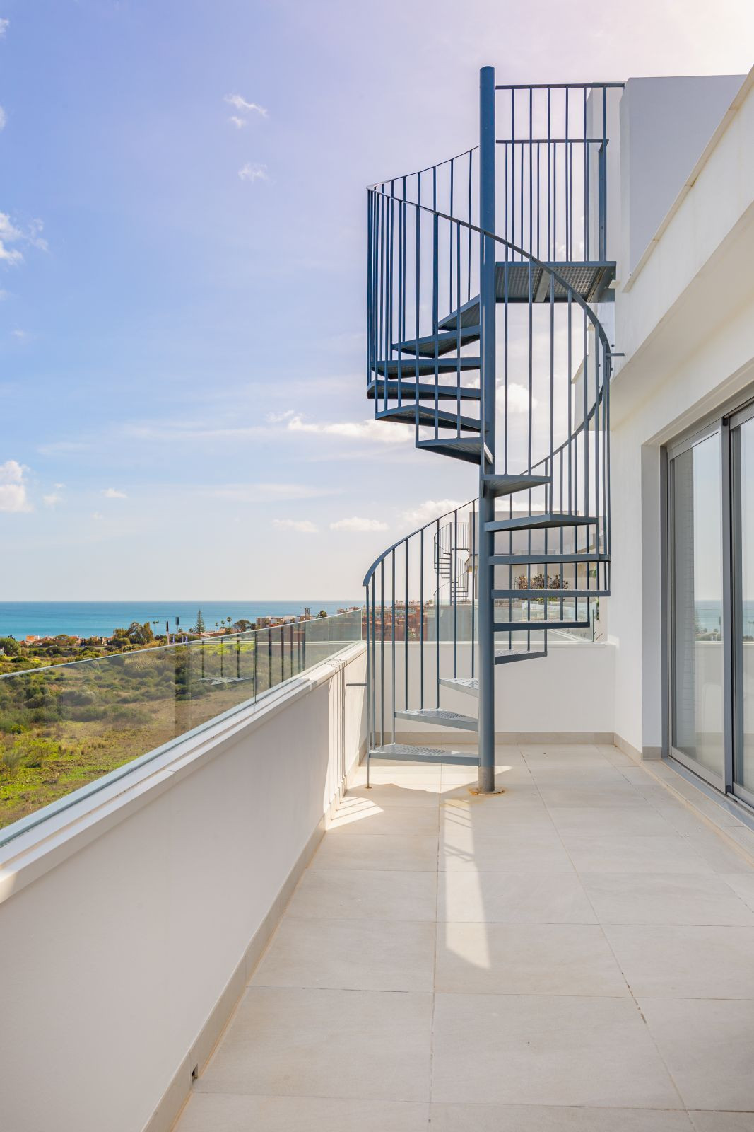 On the same floor as the living and bedrooms, this penthouse has terraces on three sides, including east- and southwest-facing ones, with panoramic views. An outdoor staircase leads to a very large roof terrace with spectacular 360° panoramic views of the sea, the mountain range, and the pool.