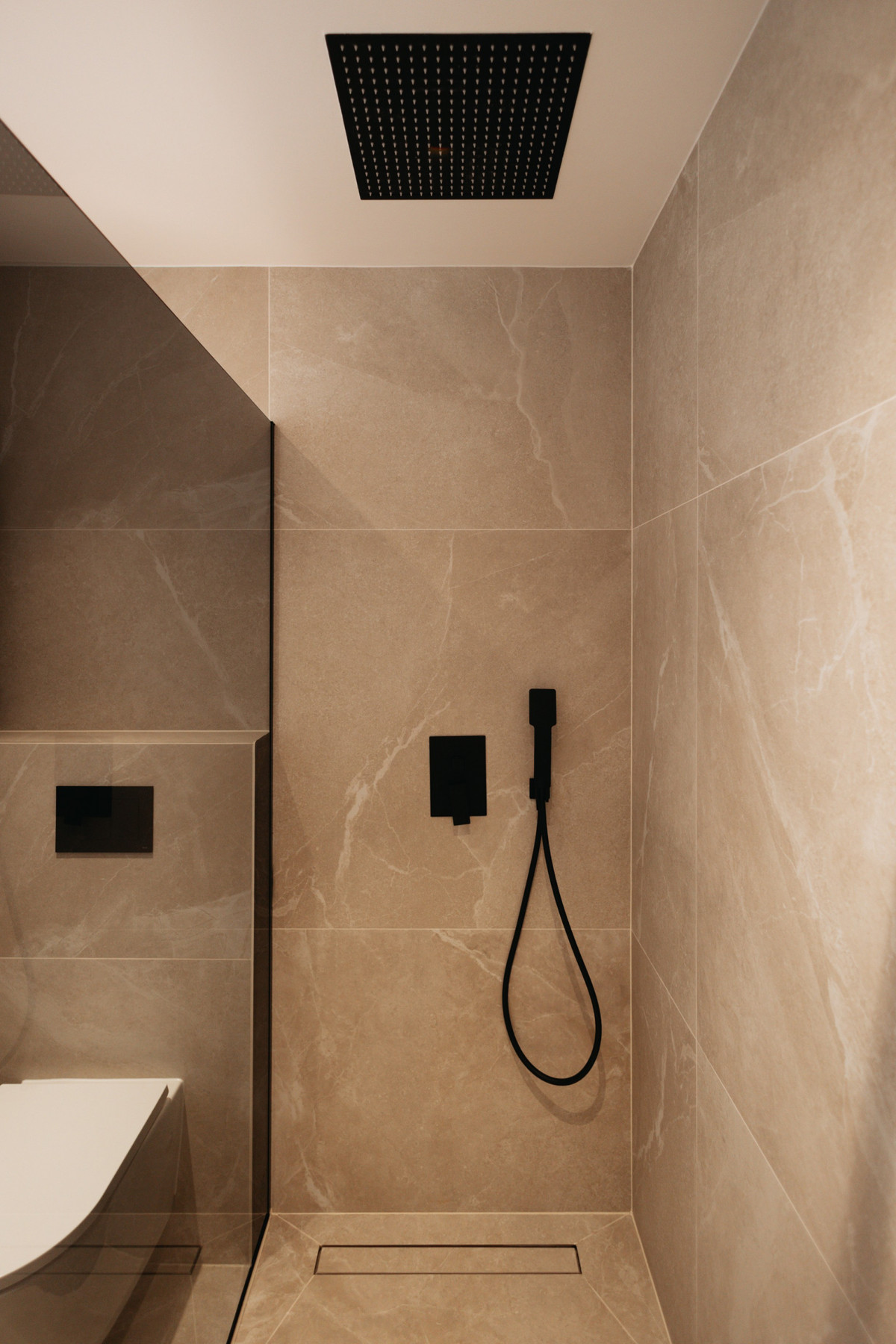 The lower level features two generously sized bedrooms with double beds, built-in closets, and a spacious storage room. The stylish bathroom is fitted with a luxury rain shower, underfloor heating and includes both a washing machine and dryer for added convenience.