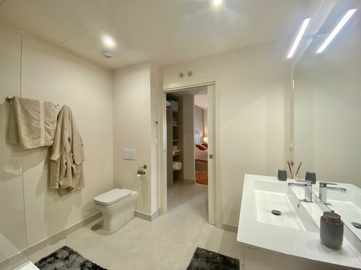 The open-concept kitchen is fully equipped with high-efficiency appliances (Bosch) and an advanced aerothermia climate system, blending sustainability with style. It connects harmoniously to a bright and airy living-dining area, both designed to maximise natural light and indoor-outdoor living. The master suite enjoys direct terrace access and a spa-inspired bathroom with walk-in shower and bathtub, while the second bedroom features fitted wardrobes and its own private terrace. UF heating in both bathrooms adds an extra touch of everyday luxury.