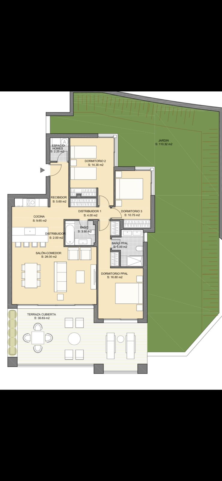 Property Features: ground floor with lift access, spacious living area with access to the terrace and private garden, fully equipped kitchen with NEFF appliances, Air conditioning (hot/cold) via Aerothermia, underfloor heating in the bathrooms, smart home system with app control for lighting, blinds and temperature.