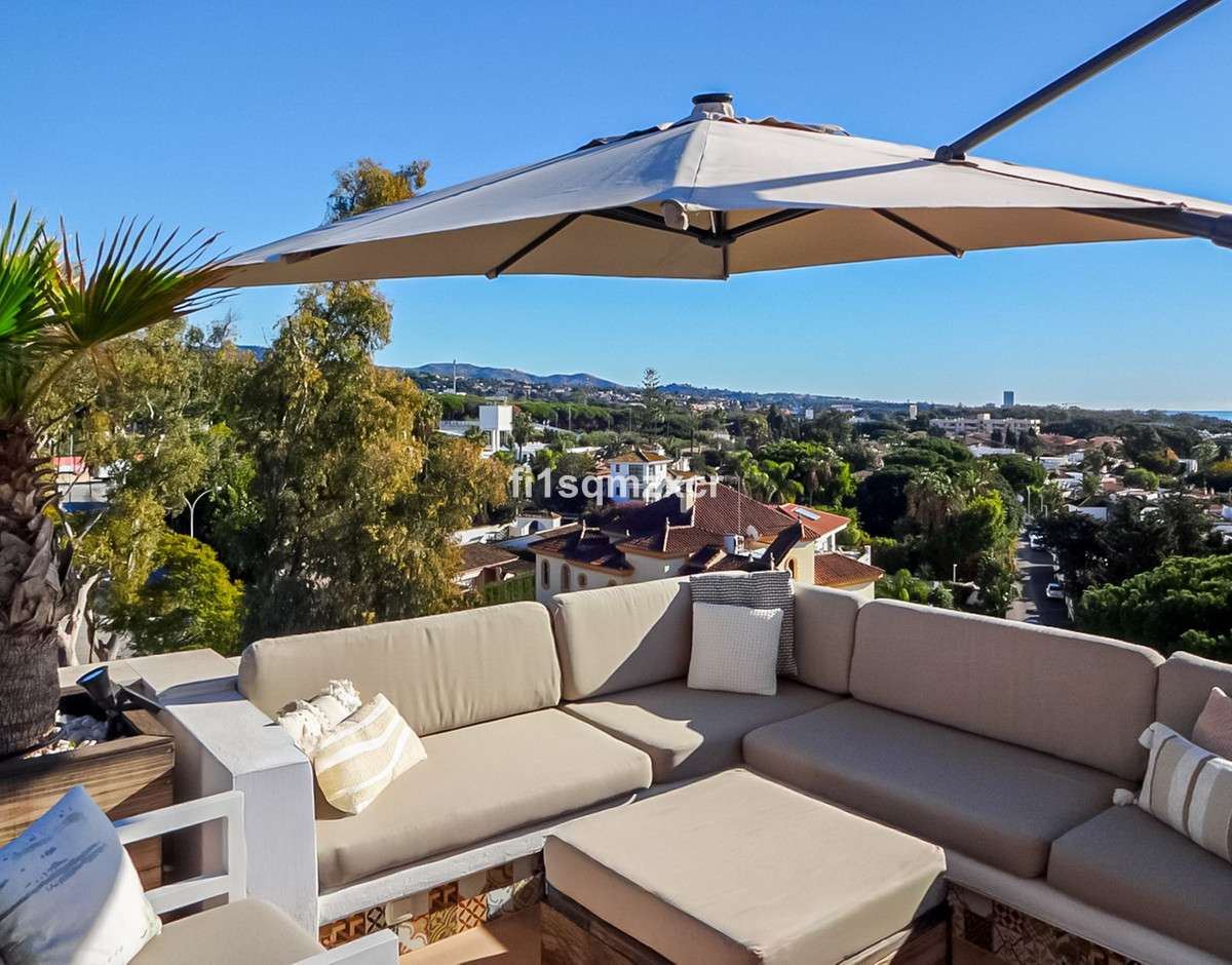 This unique corner penthouse with extraordinary views is located just a few minutes' walk from one of Marbella's most beautiful beaches, home to the best beach clubs, chiringuitos, and beach restaurants. The property has been completely redesigned and modernized with the finest materials. From the entire property, you have spectacular views of the entire coastline, Africa, and the mountains. Fourth floor: Hallway/entrance with stairs to the upper floor, guest toilet, new modern kitchen with a bar and high-quality appliances, a TV corner with a wood-burning stove for romantic evenings, a large L-shaped dining area with panoramic views, a bedroom, and a spacious bathroom.