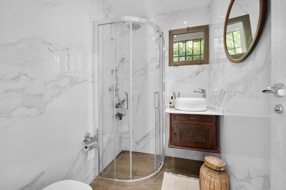 Les trois chambres sont spacieuses et la villa comprend deux salles de bains récemment rénovées avec douches à l'italienne. Au rez-de-chaussée, l'ancien garage a été transformé en un espace de vie chaleureux et élégant, idéal pour les réunions de famille ou comme chambre supplémentaire.