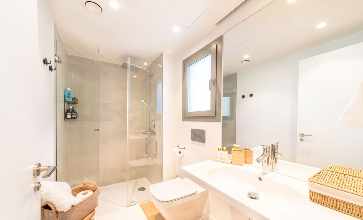 Upstairs, you'll find three bedrooms, including a master suite with a private bathroom featuring a shower and bathtub. The other two bedrooms share an additional full bathroom. Two of the bedrooms have access to another large terrace, perfect for soaking up the sun and enjoying the views.