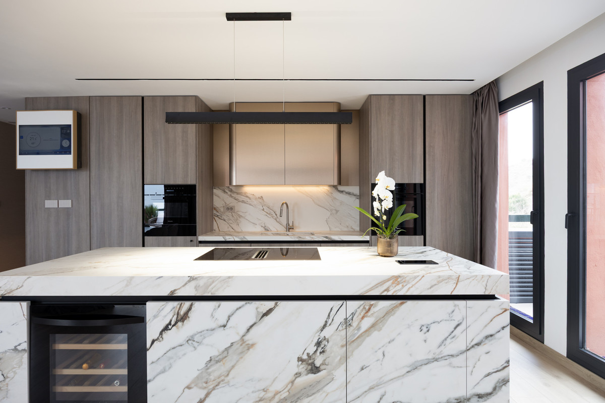 Cette résidence d'exception offre un mariage raffiné de design, de confort et de panorama à couper le souffle. D'une superficie de 145 m², l'appartement dispose de deux terrasses privatives totalisant 45 m², chacune agrémentée d'une végétation luxuriante, d'un système d'arrosage automatique et d'un jacuzzi privé. La vue à 270° embrasse la mer, le littoral et les collines environnantes ; par temps clair, on aperçoit même Gibraltar et les côtes africaines au loin. Un garage privatif de 14 m² avec accès direct par ascenseur garantit confort et exclusivité.