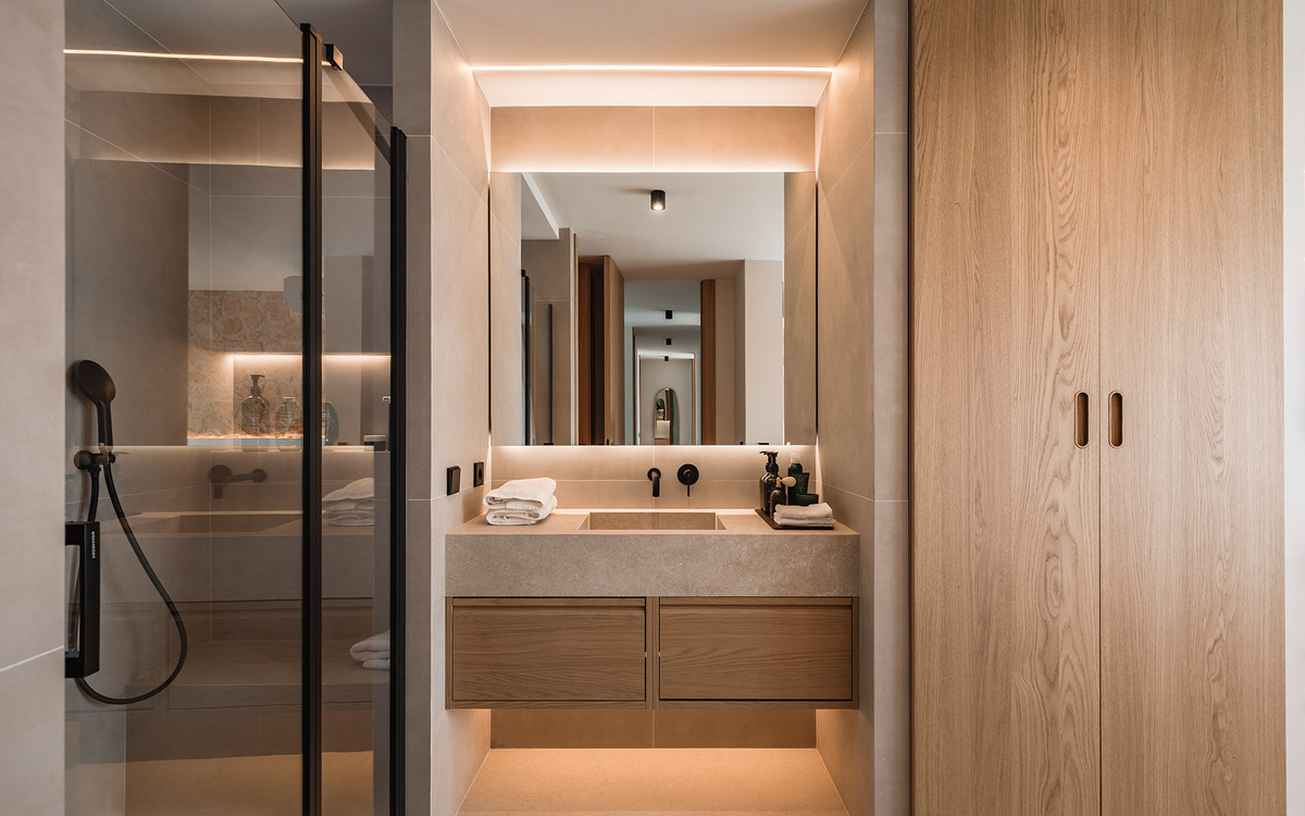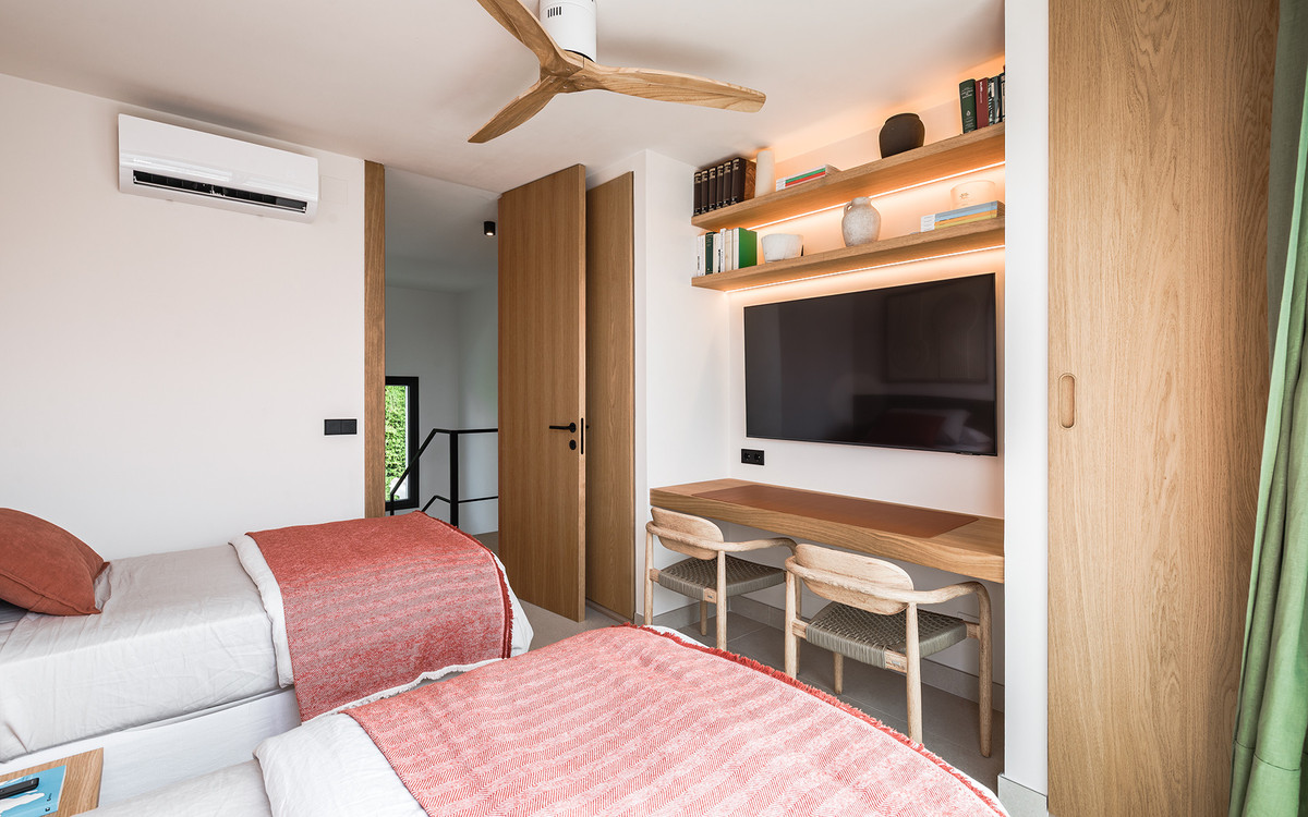 La villa comprend six chambres doubles, cinq salles de bains (dont quatre privatives) et deux toilettes pour invités. Trois des chambres donnent directement sur une terrasse offrant une vue imprenable sur les montagnes et la nature environnante. Un parking pour deux voitures et une borne de recharge pour véhicules électriques sont à disposition.