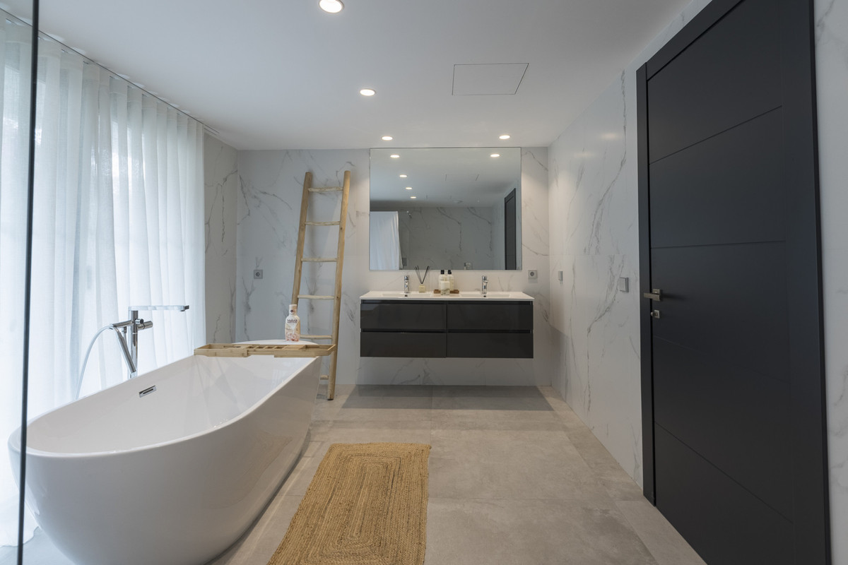 The villa offers an exceptional outdoor area, including a tennis court and a large garden. There is also a guest toilet and changing room—ideal for enjoying the outdoor lifestyle. Next to the stunning 14-meter-long, 2.5-meter-deep pool, you'll find an elegant outdoor dining area, perfect for entertaining.