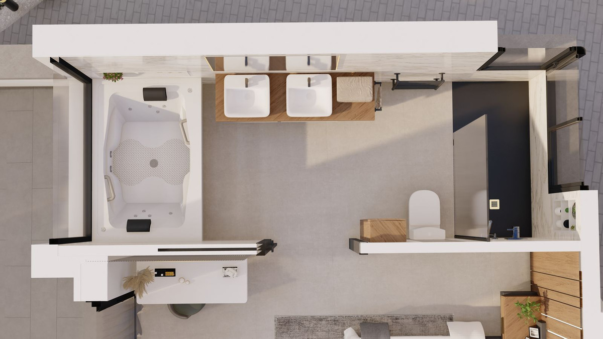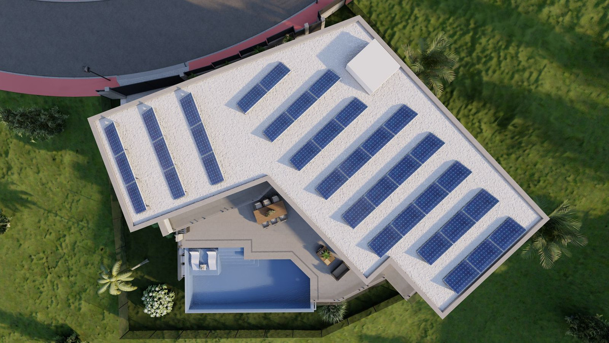 For added convenience, there is an outdoor bathroom in the pool area. The upper floor features three bedrooms, each with its own en-suite bathroom, ensuring privacy and comfort for all residents. The villa also boasts state-of-the-art energy-efficient features, including underfloor heating and aerothermal technology, as well as solar panels for maximum energy savings.
