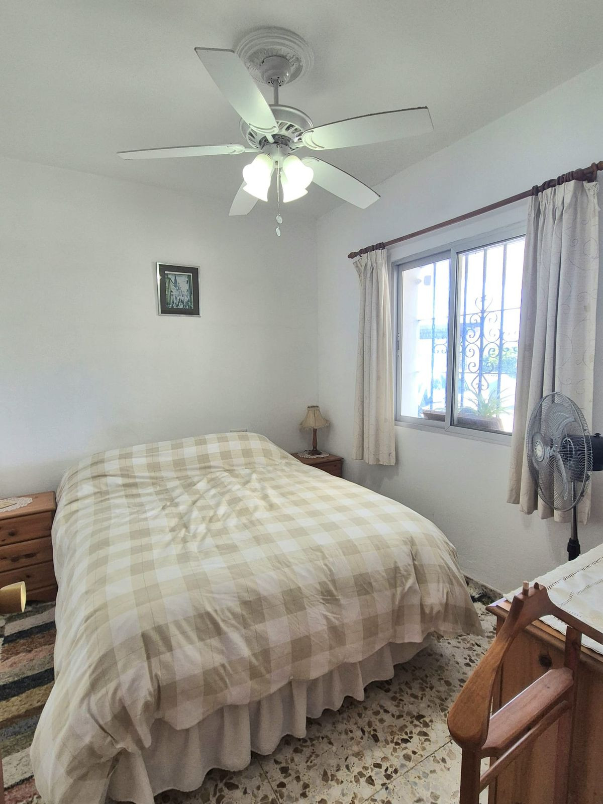 On accède à la maison par un porche couvert donnant sur un hall d'entrée avec un placard sur la gauche, une salle de bains et la cuisine entièrement équipée. À droite se trouve l'ancien salon avec cheminée, actuellement aménagé en salle à manger. De là, des portes-fenêtres donnent accès au porche couvert et à deux chambres. À gauche du salon se trouve la chambre principale avec placards intégrés et une grande salle de bains avec baignoire et douche séparées. Plus loin dans le hall d'entrée se trouve un très spacieux séjour offrant une vue imprenable et un accès à une autre terrasse.