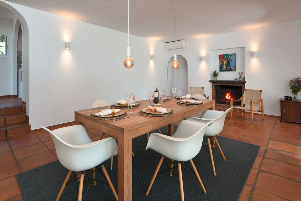 Cette magnifique villa de style hacienda est située dans un quartier résidentiel calme d'Artola Alta, à proximité de Cabopino. À quelques pas seulement de la réserve naturelle, des dunes et de la plage d'Artola, ainsi que de la plage et du port de Cabopino, avec ses restaurants et supermarchés, elle offre un accès facile à la nature. La villa se compose de trois chambres, deux salles de bains, deux salons, une cuisine et une buanderie. De plain-pied, elle est fonctionnelle et garantit l'intimité de ses occupants, la suite parentale étant séparée des chambres et salles de bains des invités par le salon et la salle à manger. Entourée d'un mur d'enceinte, la maison est parfaitement isolée. L'accès à la propriété se fait par le nord, via un portail donnant sur un patio. Ce dernier dessert un garage double et une entrée couverte menant à la maison. L'entrée dessert une cuisine entièrement équipée et une grande salle à manger. Le salon s'ouvre sur le jardin et la piscine, et donne également accès à une terrasse couverte. La piscine est nichée au cœur d'un jardin tropical luxuriant et arboré de nombreux arbres fruitiers. La propriété dispose également d'une terrasse sur le toit de 20 m² d'où vous pourrez admirer la mer et le coucher de soleil sur la baie de Marbella et la montagne de La Concha.